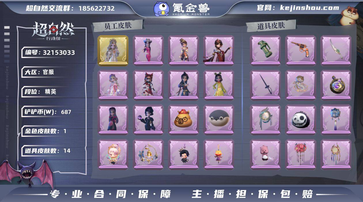 【CZRD284】【耀世皮肤】:薇薇安-圣光之谕,小黄-遗失的童话,巫铃儿-镜花辞 【典藏皮肤】:小黄-呱呱雨衣,小黄-霓裳踏雪,逍遥-绣春逍影,爱丽丝-耀眼的你,爱丽丝-冰公主,爱丽丝-丝缕哀歌,薇薇安-白光莹,薇薇安-仙锋小姐,薇薇安-黑月挽歌,巫铃儿-素影瑶光,阿念-王子与骑士,莉莉-除妖小师妹,莉莉-莓果陷阱,莉莉-情公主 【账号已绑定信息】:密保手机 【头饰】:烛光纪念,太空鲨头套,雪墩墩头套,樱桃奶油布丁,小财神豚豚头套,惊魂南瓜头套,精致露比头套,火爆了头套,大葱明头套,炙热烧烤,小狗蛇点点头套,呆滞头套,滑稽头套,卑微头套,嘻嘻头套,驼半仙头套,鱼头怪头套,面具马头套,烈焰红唇头套,萨卡班甲鱼头套,像素朋克墨镜 【道具皮肤】:铲子-赞萌波板糖,铲子-龙鳞,传送按钮-幻宠之门,桃木剑-凤鸣九天,桃木剑-最后的独角兽,桃木剑-永眠曲,腰包-宝剑八,额外的背包-飞花令,长枪-罪棘,长鞭-小狗蛇点点鞭,摸金符-花落精绝,短管猎枪-赞萌露比水枪,专业手电-云端梦想计划,葫芦-伏妖塔,黄牛能量饮料-青玉抱丹,夜视仪-金丝眼镜,音响-happy猫,音响-鸣沙鼓,刺刀-小鲨匕首,刺刀-碧络琅环,荧光棒-桃心,转轮手枪-新星时代,喷气背包-乘风溯雪,电击枪-甜蜜泡泡枪,急救包-蔷薇物语,闪光弹-金戈玄铜 【金色动作】:知世摇,七仔摇,luvaboy,鹏友摇,DL摇,刀马舞,伤心摇,舞台中心,小雨摇 【紫色动作】:带你逃跑吧,要糖,举牌,KT猫摇,抬手,律动迪斯科,山楂树之舞 【载具涂装】:惊奇万圣涂装 【美妆】:暗夜小恶魔 【背饰】:牛啤背包,兜风日程,蝶恋花,天使的呼唤,绒团小狐狸,云梦之星 【挂饰】:糖果守卫,九色祥鹿,钗头凤,小鲨包包,未竟乐园,天使消失的年代 【工牌动作】:虔诚之姿,元气剪刀手,默认姿势 【工牌背景】:卷珠帘,默认工牌,永夜巡礼,...