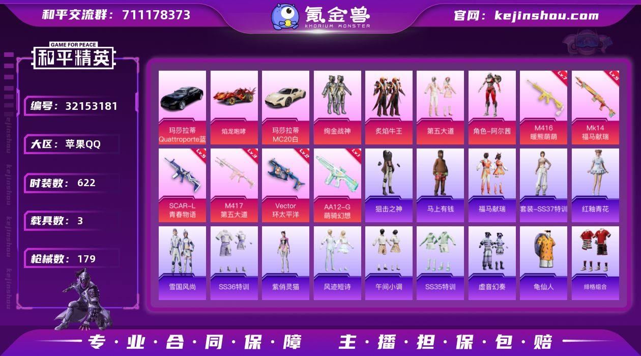 实名:可二次实名 是否支持人脸包赔:不支持 粉装数量:4 特效枪数量:6 载具数:3 时装数:622 枪械数:179 阿尔茜,炙焰牛王,第五大道,绚金战神 七级M416-暖熊萌萌,五级MK14-福马献瑞,五级SCAR-L-青春物语,三级M417-第五大道,二级Vector-环太平洋,一级AA12-G-萌骑幻想 玛莎拉蒂Quattroporte(夜幕蓝),玛莎拉蒂MC20(星石白),焰龙咆哮 狙击之神,马上有钱,福马献瑞,红釉青花,SS37特训,雨过天青,雪国风尚,SS36特训,炫彩糖果,紫俏灵猫,风迹短诗,SS35特训,午间小调,暗黑骑手,暗夜傀儡,暗夜之虎,暴风机械师,北国孤狼,白色伏地魔,冰原奔狼,长空猛禽,潮流先锋,潮流炫酷,潮流游乐家,潮萌小黄鸭,迪迦奥特曼,都市魅力,绯格组合,疯狂小兔子,粉团憨憨,福星高照,飞行日记,格斗先锋,龟仙人,光影梦想家,幻彩翩翩,鹤发童颜,虎虎生威吉莉,湖蓝色名流,黑色伏地魔,黄色伏地魔,灰色格斗者,黄色名流,海上生明月,黄色运动,红色运动,幻世战舞者,浑天鲲鹏,和煦暖阳,幻影武者,军刀雅典娜,酒红色名流,惊鸿侠骨,橘黑制服,娇憨猪猪,竞技达人朋克,竞技名士,竞技勇士朋克,吉莉礼服,极速红龙,街头潮人,锦衣飞扬,金耀舞者,科技之星,狂沙舞者,蓝彩潮人,蓝调潮人,龙的传人,猎鹰,浪漫波比,蓝色守护者,蓝色运动,龙腾端午,冷焰舞者,猛禽,妙红点点,梦幻奶油,萌黄之夏,魅力单车,麻辣教官,萌趣咩咩,萌趣颜团子,梦魇先生,霓虹极客,柠萌假日,牛气冲天,牛气满满,破蛋小黄鸡,破晓战魂,青春冒险家,青春校园,轻风白浪,绮丽涂鸦,青年教官,人气偶像,燃烧卡路里,深海格斗者,时空追击者,深蓝色名流,森林游猎者,沙漠探路者,神气柴柴,帅气教官,SS10特训,SS12特训,SS13特训,SS14特训,SS15特训,SS16特训,SS17特训,SS18特训,SS19特训,SS20特训,SS21特训,SS22特训,SS23特训,SS24特训,SS25特训,SS7特训,SS8特训,SS9特训,时尚圣诞,闪银刀客,甜蜜熊情侣,特训学院,甜心亚梦,突袭者,田园牧歌,特战英豪,特种颜团子,特战装甲,完美偶像,西部风情,星辰守护者,小丑鱼,迅捷狂鲨,炫蓝之夏,迅猛虎鲸,虚音幻奏,绚紫流光,迎春赐吉,熠彩粉晶,异彩先驱,耀粉歌者,雨林探路者,玉兔迎春,野性战魂,野性战心,英勇保护者,鹰眼刺客,耀眼新星,战地督导,灼焰舞者,治愈之星 炫彩糖果飞行器,拂晓神骑飞行器,王牌四分卫飞行器,炫彩糖果降落伞,阿狸红降落伞,垂柳戏鸭降落伞,第五大道降落伞,环太平洋降落伞,梦幻火箭降落伞,暖熊萌萌降落伞 卖家说:连体号