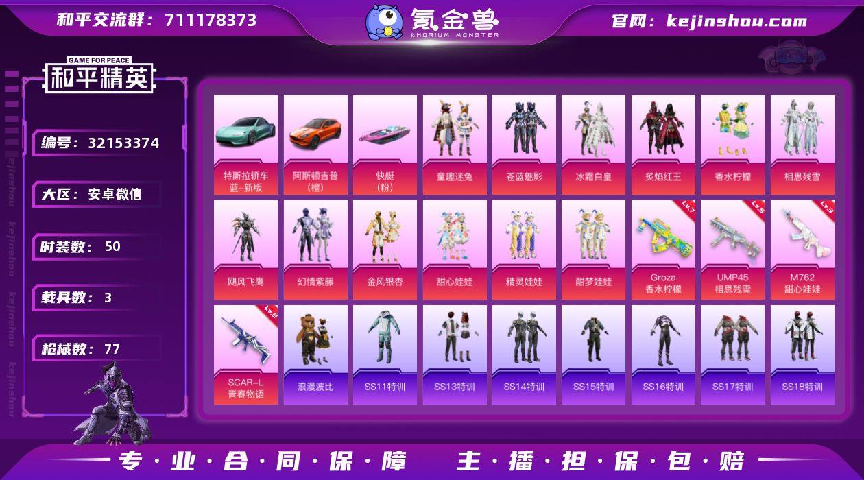 安卓 微信-12粉装-4特效枪-3载具-2粉色飞行器-33673热力值-3王牌印记-50套装-77枪皮 【热门品类】:粉装-童趣迷兔,套装-浪漫波比 【粉色载具】:特斯拉Roadster(水滴蓝),阿斯顿马丁DBX(橙),空客H135-蔚蓝之翼,快艇-塞莎KL27(霓虹粉) 【粉色套装】:粉装-苍蓝魅影,粉装-冰霜白皇,粉装-童趣迷兔,粉装-炙焰红王,粉装-香水柠檬,粉装-相思残雪,粉装-飓风飞鹰,粉装-幻情紫藤,粉装-金风银杏,粉装-甜心娃娃,粉装-精灵娃娃,粉装-酣梦娃娃 【粉色枪皮等级】:SCAR-L-青春物语(二级),GROZA-香水柠檬(七级),M762-甜心娃娃(三级),UMP45-相思残雪(五级) 【粉色枪皮】:SCAR-L-青春物语,GROZA-香水柠檬,M762-甜心娃娃,UMP45-相思残雪 【粉色飞行器】:荧光虫舞飞行器,相思残雪飞行器 【粉色降落伞】:激战未来降落伞,香水柠檬降落伞,相思残雪降落伞,甜心娃娃降落伞 【稀有枪皮】:AKM-夜灯,AKM-彩虹符号,AKM-星之彼岸,AKM-萌趣颜团子,AKM-虎虎生威,AKM-霓虹街区,M16A4-甜心亚梦,M416-仓鼠灰灰,M416-红色方程式,M416-蓝色火焰,GROZA-异彩先驱,GROZA-彩虹符号,GROZA-治愈之星,AUG-青春冒险家,QBZ-彩虹符号,QBZ-相思残雪,M762-镭射皇者,Mk47-青春冒险家,G36C-时空追击者,AC-VAL-甜心亚梦,UMP45-时空追击者,UMP45-生命誓言,Vector-彩虹符号,Vector-治愈之星,Vector-香水柠檬,汤姆逊-异彩先驱,野牛-青春冒险家,MP5K-异彩先驱,P90-飞驰魅影,Kar98K-彩虹符号,Kar98K-飞驰魅影,M24-治愈之星,M24-香水柠檬,SKS-时空追击者,SKS-炫彩节奏,VSS-镭射皇者,Mini14-异彩先驱,Mini14-甜心娃娃,Mini14-耀粉歌者,Mk14-暗星紫秘,Mk14-治愈之星,Mk14-相思残雪,Mk14-童趣迷兔,QBU-青春冒险家,S686-生命誓言,S1897-碧影闪光,S1897-镭射皇者,S12K-童趣迷兔,S12K-香水柠檬...