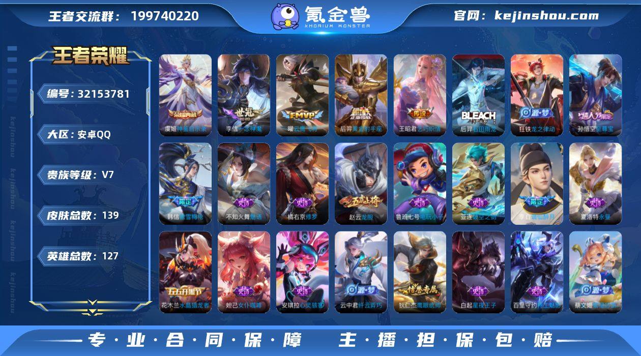 V7 1典藏 7传说 127英雄 139皮肤 可修改实名 男号 【英雄全皮】影全皮,大禹全皮 【稀有英雄】大司命,嬴政(始皇帝),韩信(韩跳跳),夏洛特(夏师傅),艾琳,橘右京(橘子),娜可露露(鸟人),不知火舞,赵云,金蝉(唐僧),戈娅 【荣耀水晶】神鉴启示录 【传说皮】黄金射手座,一念神魔,云鹰飞将(小将军),乞巧织情 【珍宝阁皮】胡桃夹子,蔷薇恋人 【赛季/战令皮】噬灭天穹(s37),擒涛扼浪(s31),探海日志(s32),天穹祈灯(s34),天穹之誓(s36),御旌(s15),御銮(s16),朔风刀(s17),混沌棋(s18),疑决卦(s19),醍醐杖(s20),原初探秘者(s21),演武夺筹(s23),驱傩正仪(s24),银河之约,星际陆战队-达摩,云中旅人(s29) 【史诗皮】谪仙醉月,破空之剑,线条小狗-周瑜,龙之律动,石田雨龙,紫霞仙子,电玩小子(小书包),特工魅影,永昼,冰冠公主,偶像歌手,魅语,白蛇,猫狗日记-孙策,节奏热浪,修罗,女仆咖啡,水果甜心,天才门将,星夜王子,心灵骇客,功夫厨神,暗隐猎兽者,鬼剑武藏,纤云弄巧,繁星吟游(呼啦呼啦),缤纷独角兽,逐浪之夏,水晶猎龙者,金属风暴,圣诞恋歌,鹰眼统帅,魅力维加斯,赏金猎手,无心,未来纪元-赵云 【限定皮】愿照·九州拓(澜年限),逐霄战戟,鸣野蒿,至尊宝,傲雪梅枪,龙胆,逐梦之影,深海之息(深海大菠萝) 【普通皮】谧流熔炉,敬我三分,铁骨偃魂,苍林狼骑,雪境奇遇-西施,星梦巡礼,功夫炙烤,龙舞盛年,魅影绮裳,虚灵犬护,鹤鸣心笺,春野闲踪,命运加冕,小满鸭,踏浪烽翎,妄想特派,鬼谷子天穹祈灯(S34),威尼斯狂欢,万事如意,龙腾万里,花好人间,归虚梦演-蒙犽,海滩派对,皇家上将,魔术师,掌控之力,霸王丸,缤纷绘卷,特工战影,圆桌骑士(盾山),乓乓大师,万象初新,黄金武士,次元突破,大发明家,教廷特使,星际陆战队(程咬金),阴阳师,死亡骑士,少女阿狸,爱心护理,拳王,玩偶对对碰,瓷语鉴心,幻想奇妙夜,重装意志,圆桌骑士-太乙真人,修竹墨客,荷鲁斯之眼,伊势巫...