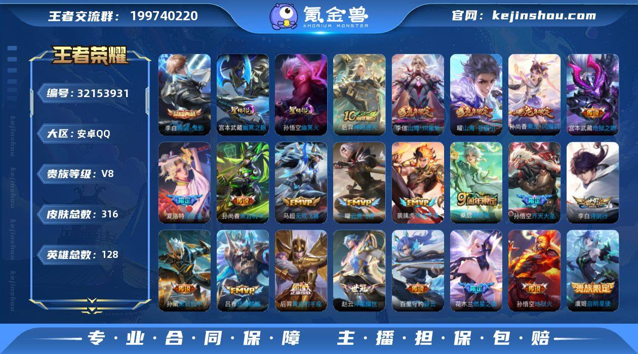 王者19296,不可二次,安卓Q-V8-至尊星耀IV段位-128英雄-316皮肤-1典藏皮肤-23传说-80史诗 【英雄全皮】:狂铁全皮,影全皮 【荣耀典藏】:李白鸣剑曳影 【传说皮肤】:后羿神树通天,裴擒虎祥瑞亨通,桑启鸣野蒿,孙尚香乘龙问璇玑,夏洛特浮生妄,花木兰燃星之曲,孙悟空齐天大圣,曜山海苍雷引,李信山海炽霜斩,吕布怒海麟威,李白诗剑行,百里守约碎云,马超无双飞将,孙策末日机甲,赵云淬星耀世,铠绛天战甲,虞姬启明星使,曜云鹰飞将,张良黄金白羊座,后羿黄金射手座,孙尚香末日机甲,宫本武藏地狱之眼,孙悟空地狱火 【限定皮肤】:白起狰,蒙犽顽岩魄,大乔绒语心约,姜子牙天穹之誓,狄仁杰阴阳师,虞姬凯尔特女王,赵云皇家上将,赵云引擎之心,嬴政优雅恋人,孙尚香蔷薇恋人,钟无艳超时空战士,扁鹊奇幻香踪,元歌云间偶戏,元歌无心,甄姬游园惊梦,甄姬落雪兰心,曹操烛龙,典韦穷奇,马可波罗暗影游猎,马可波罗山海玄木吟,狄仁杰魔术师,狄仁杰万华元夜,达摩沙漠行僧,项羽海滩派对,老夫子醍醐杖,貂蝉逐梦之音,程咬金演武夺筹,韩信傲雪梅枪,王昭君午后时光,兰陵王金庭之子,花木兰燃星之曲,亚瑟潮玩骑士王,孙悟空美猴王,孙悟空至尊宝,孙悟空齐天大圣,牛魔御旌,后羿圣弓游侠,刘备百相守梦,李元芳银河之约,李元芳云中旅人,虞姬启明星使,钟馗驱傩正仪,杨玉环遇见飞天,杨戬潮玩骑兵,女娲朔望之晖,太乙真人饕餮,鬼谷子原初探秘者,鬼谷子五谷丰年,苏烈千军破阵,弈星混沌棋,沈梦溪星空之诺,沈梦溪大漠名商,沈梦溪匿光破解者,明世隐疑决卦,裴擒虎李小龙,裴擒虎擒涛扼浪,狂铁御狮,狂铁电玩高手,米莱狄御霄,云中君纤云弄巧,李信山海炽霜斩,盾山御銮,上官婉儿梁祝,嫦娥暖冬兔眠,曜山海苍雷引,鲁班大师探海日志,桑启海盐诗旅,夏洛特浮生妄,暃星界游侠,阿...