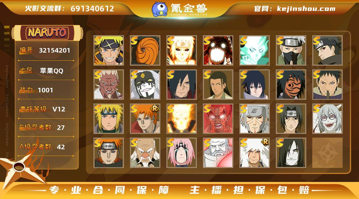 实名: 可修改 贵族等级: V12 S忍数: 27 A忍数: 42 战力值(万): 1001 S级忍者: 佩恩·天道「超」,药师兜「仙人模式」,千手扉间「秽土转生」,佩恩「天道」,大蛇丸,波风水门,宇智波鼬 「须佐能乎」,迈特凯「死门」,大野木 「忍界大战」,宇智波带土 「忍界大战」,自来也 「舞之豪杰」,漩涡鸣人 「九喇嘛连结」,大筒木金式「博人传」,春野樱 「忍界大战」,神秘面具男 「红夜之刃」,宇智波佐助「永恒万花筒」,千手柱间·木叶创立,宇智波斑「秽土转生·解」,大筒木桃式,艾「忍界大战」,宇智波止水「须佐能乎」,旗木卡卡西「须佐能乎」,大筒木舍人 「最终章」,漩涡鸣人 「暴怒·第六尾」,波风水门「九喇嘛连结」,宇智波斑「五影会谈」,漩涡鸣人·宇智波佐助 通灵兽: 熊猫 亮点: 【优质装备】:熊猫,佩恩·天道「超」,药师兜「仙人模式」,千手扉间「秽土转生」,迈特凯「死门」,宇智波带土 「忍界大战」,漩涡鸣人 「九喇嘛连结」,大筒木金式「博人传」,春野樱 「忍界大战」,神秘面具男 「红夜之刃」,宇智波佐助「永恒万花筒」,千手柱间·木叶创立,宇智波斑「秽土转生·解」,大筒木桃式,艾「忍界大战」,宇智波止水「须佐能乎」,旗木卡卡西「须佐能乎」,大筒木舍人 「最终章」,漩涡鸣人 「暴怒·第六尾」霸体lv9