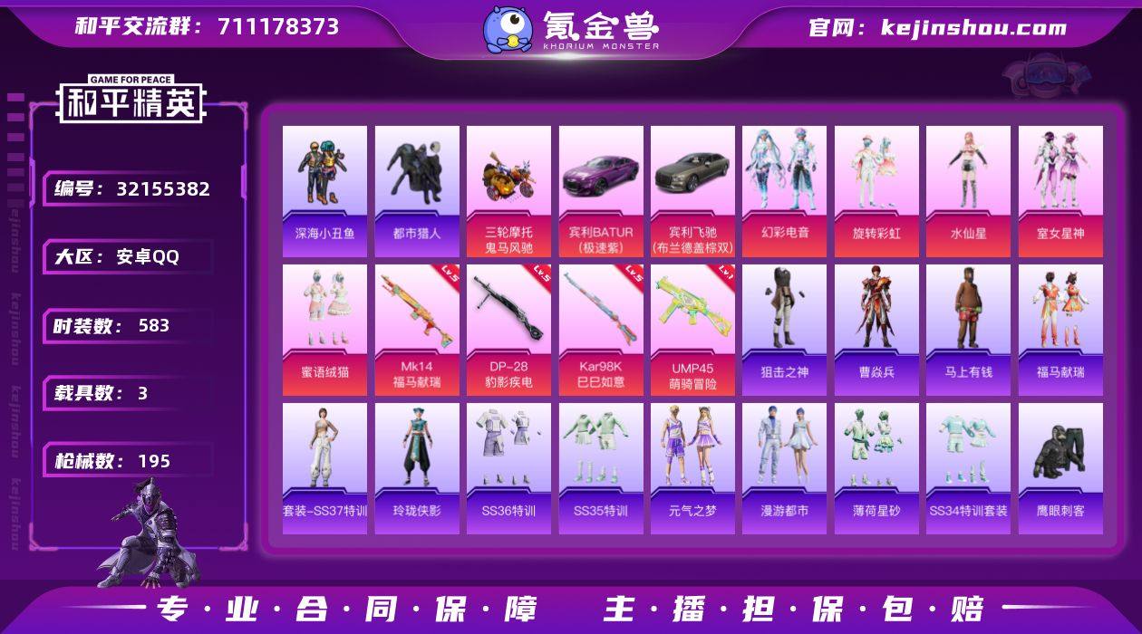 实名: 可修改 时装数: 583 载具数: 3 枪械数: 195 战备数: 174 热门装扮: 深海小丑鱼,鹰眼刺客,都市猎人,旋转彩虹,水仙星,室女星神,蜜语绒猫,幻彩电音 载具: 鬼马风驰,宾利BATUR(极速紫),宾利飞驰(布罗德盖棕双色) 稀有枪皮: Kar98K-巳巳如意,DP-28-豹影疾电,UMP45-萌骑冒险