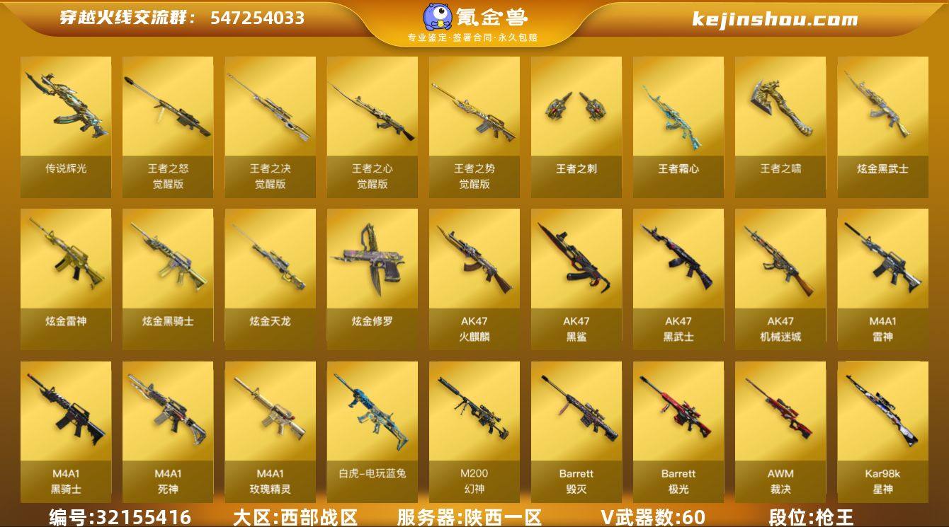 【ky6261】陕西一区-66V-7王者武器数-8炫金武器数 【传说武器】:传说辉光 【传说角色】:传说女帝 【热门武器】:传说辉光,QBZ03-金色蔷薇,Scar Light-白虎,HK417-朱雀,M200-幻神,死亡之眼,白虎-电玩蓝兔,Kar98K-星神,牛牛-AK47,M4A1-黑骑士,汤姆逊-烈龙*4,RPK-盘龙,加特林-炼狱*2,羊驼玩偶,沙鹰-修罗*4 【王者炫金武器】:王者霜心,王者之刺,王者之啸,炫金骑士,炫金雷神*3,炫金武士,炫金天龙*2,炫金修罗 【音效卡】:M4A1-雷神音效卡,Barrett-毁灭音效卡,AWM-裁决音效卡,白鲨语音包 【皮肤】:M200-幻神-黄忠皮肤,裁决-星际旅行 皮肤,雷神-荣耀之魄,雷神-虎将,M4A1-战神赵云,雷神-宇航兔皮肤,火麒麟-轻羽皮肤,毁灭-荣耀之怒,毁灭-直播专属,黑骑士-暗月*2,黑骑士-冠军之势,AK47-B-常胜将军-刘备 【角色】:魅影,零·纪元,王者春,风暴女,嘉年华灵狐,龙儿,潘多拉-X,樱-缤纷夏日,幽,职业选手 【人偶武器】:天龙-曼陀罗,火麒麟-灵狐,M4A1-雷神-精英刀锋,AWM-灵狐-15周年嘉年华,M37-葵,牛牛-AK47,迷你超能女侍 【暴走生化】:死亡之眼,超级对讲机 【挑战大师】:神圣爆裂者-末日III 【英雄级武器】:AK47-火麒麟,M4A1-雷神,M4A1-黑骑士,M4A1-死神,AK47-黑武士,AK12-天启,AN94-超新星,AK47-机械迷城*2,AK47-黑鲨,HK417-朱雀,Scar Light-白虎,QBZ03-天罚,M4A1-玫瑰精灵,QBZ03-金色蔷薇,9A91-烈火,王者之心-觉醒版,王者之势-觉醒版,AK-47-猩红传说,AK47-B-战神,AK47-B-常胜将军,白虎-电玩蓝兔,Barrett-毁灭,Barrett-极光,AWM-裁决,M200-幻神,Kar98K-星神,Barrett-金色蔷薇,王者之怒-觉醒版,王者之决-觉醒版,RPK-盘龙,加特林-炼狱*2,汤姆逊-烈龙*4,沙鹰-修罗*4,柯尔特-竞技荣光,龙啸*7,麒麟刺,擎天-竞技荣光*2,高爆手雷-竞技荣...