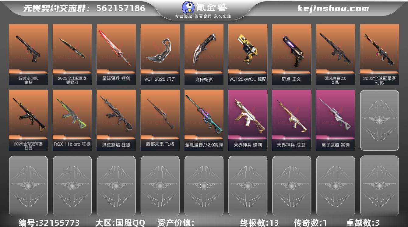 【qyz9490】【套装】:2025全球冠军赛套装,VCT 2025 赛季套装 【英雄】:幻棱,炼狱,维斯,暮蝶,壹决,铁臂,捷风,雷兹,幽影,不死鸟,贤者,猎枭,零,芮娜,奇乐,尚勃勒,霓虹,斯凯,夜露,星礈,K/O,盖可,黑梦,钢锁 【近战武器】:近战武器-2025全球冠军赛 蝴蝶刀,近战武器-VCT 2025 爪刀,近战武器-诡秘蛇影 军刀,近战武器-星际猎兵 短剑 【狂徒】:狂徒-2025全球冠军赛,狂徒-洪荒怒焰,狂徒-RGX 11z Pro,狂徒-诡秘蛇影 【幻影】:幻影-2022全球冠军赛,幻影-混沌序曲//2.0,幻影-末日之翼 【戍卫】:戍卫-天界神兵,戍卫-折光棱晶 【冥驹】:冥驹-全息波普//2.0,冥驹-离子武器 【飞将】:飞将-西部未来,飞将-末日之翼 【莽侠】:莽侠-诡秘蛇影 【奥丁】:奥丁-末日之翼 【判官】:判官-诡秘蛇影 【骇灵】:骇灵-无限竞技 【蜂刺】:蜂刺-天界神兵,蜂刺-折光棱晶 【标配】:标配-折光棱晶 【VCT手枪】:标配-VCT25 x WOL 【正义】:正义-奇点 【鬼魅】:鬼魅-超时空卫队,鬼魅-诡秘蛇影 【短炮】:短炮-末日之翼 【卡面】:Clutch 卡面,无畏契约GO!第一卷:芮娜 卡面,无畏契约GO!第一卷:零 卡面,钢锁vs盖可 卡面,代号红色 卡面,新兵报到 卡面,V契约 卡面,无畏契约 卡面 【喷漆】:买装还是存钱 喷漆,胜利属于无畏契约 喷漆,GLHF 喷漆,无畏契约 喷漆 【挂饰】:无畏契约GO!第一卷 零 挂饰,天外飞客 挂饰,无畏契约 纪念币 挂饰