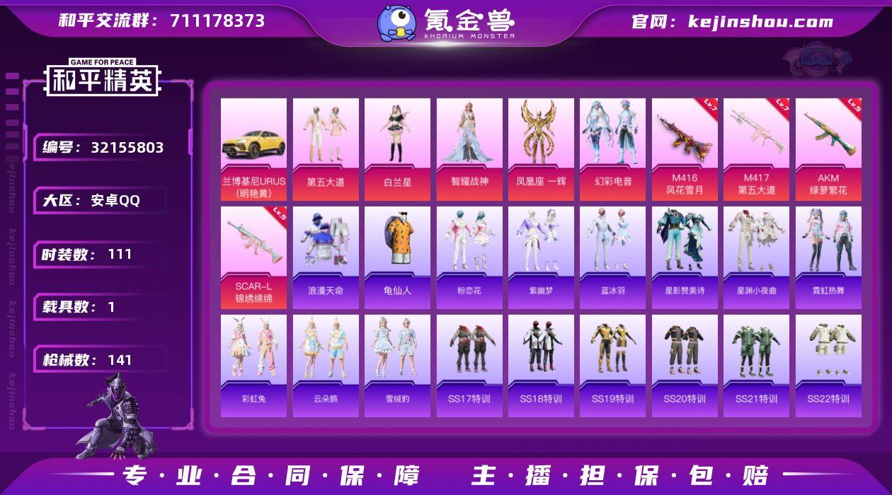 安卓 手Q-5粉装-5特效枪-1载具-0粉色飞行器-44494热力值-8王牌印记-111套装-141枪皮 【热门品类】:套装-浪漫天命,套装-龟仙人 【粉色套装】:粉装-第五大道,角色-白兰星,角色-智耀战神,角色-凤凰座 一辉,粉装-幻彩电音 【粉色枪皮等级】:AKM-绿萝繁花(五级),SCAR-L-锦绣绵绵(五级),M416-风花雪月(七级),Mk14-福马献瑞(五级),M417-第五大道(七级) 【粉色载具】:兰博基尼URUS(明艳黄) 【粉色枪皮】:AKM-绿萝繁花,SCAR-L-锦绣绵绵,M416-风花雪月,Mk14-福马献瑞,M417-第五大道 【粉色降落伞】:垂柳戏鸭降落伞,第五大道降落伞,仲夏莫吉托降落伞,超新星降落伞,智耀战神降落伞,星穹咏叹调降落伞,辉云木星降落伞 【稀有套装】:套装-龟仙人,套装-马上有钱,套装-粉恋花,套装-紫幽梦,套装-蓝冰羽,套装-星影赞美诗,套装-星渊小夜曲,套装-霓虹热舞,套装-彩虹兔,套装-云朵鹅,套装-雪绒豹,角色-霜纹水星 【稀有枪皮】:AKM-夜灯,AKM-彩虹符号,AKM-生命誓言,AKM-破晓战魂,AKM-虎虎生威,AKM-龙的传人,M16A4-红色方程式,SCAR-L-炫彩节奏,SCAR-L-玉兔迎春,SCAR-L-红色方程式,M416-夜灯,M416-糯团青竹,M416-蓝色火焰,GROZA-懵萌河马,AUG-天降萌叽,AUG-耀粉歌者,M762-天降萌叽,M762-第五大道,M762-云朵鹅,Mk47-妙红点点,G36C-懵萌河马,G36C-星穹咏叹调,AC-VAL-天降萌叽,AC-VAL-快闪甜心,蜜獾-垂柳戏鸭,蜜獾-天降萌叽,蜜獾-娇憨猪猪,UZI-啾咪啾咪,UZI-天降萌叽,UZI-娇憨猪猪,UZI-炫彩节奏,UZI-红色方程式,UMP45-仲夏莫吉托,UMP45-生命誓言,UMP45-蓝色火焰,Vector-焰鹰斗篷,Vector-彩虹符号,汤姆逊-天降萌叽,汤姆逊-暗夜鎏金,汤姆逊-炫彩节奏,汤姆逊-耀粉歌者,汤姆逊-智耀战神,AKS-74U-辉羽雀灵,P90-快闪甜心,Kar98K-彩虹符号,Kar98K-红色方程式,Ka...