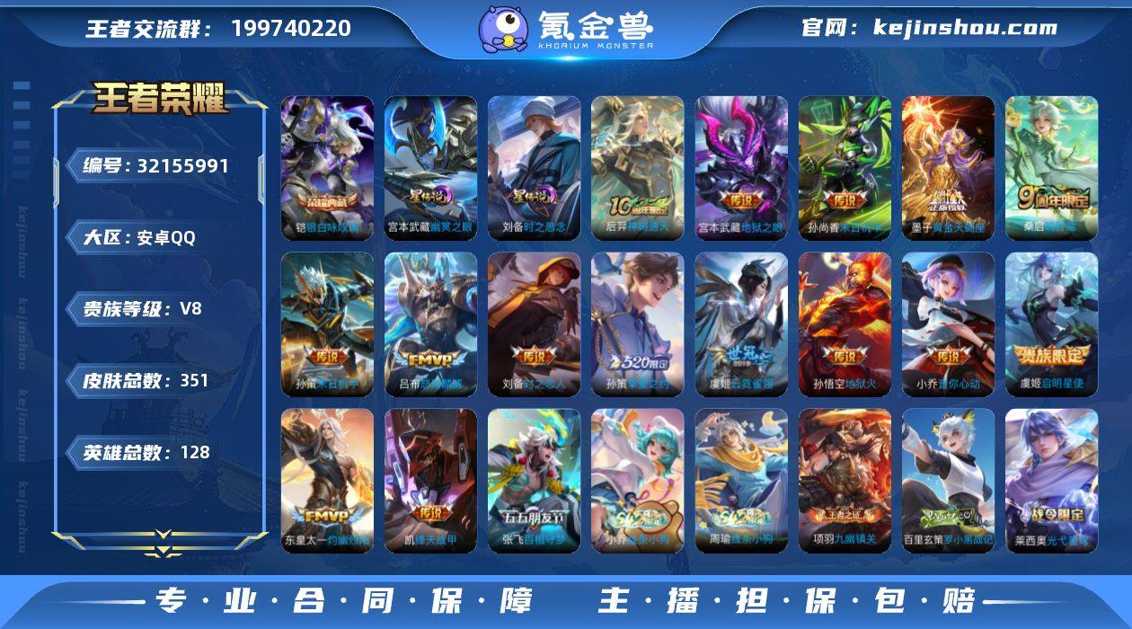 贵族等级:V8 典藏皮肤数:1 珍品无双皮肤数:0 无双皮肤数:0 珍品传说皮肤数:0 传说皮肤数:16 史诗皮肤数:105 皮肤数:351 英雄数:128 段位:王者 卖家说:金铲铲连体号 亚索金龙和紫龙 还有红蓝龙棋盘 360个小小英雄 背包内还有一颗荣耀水晶