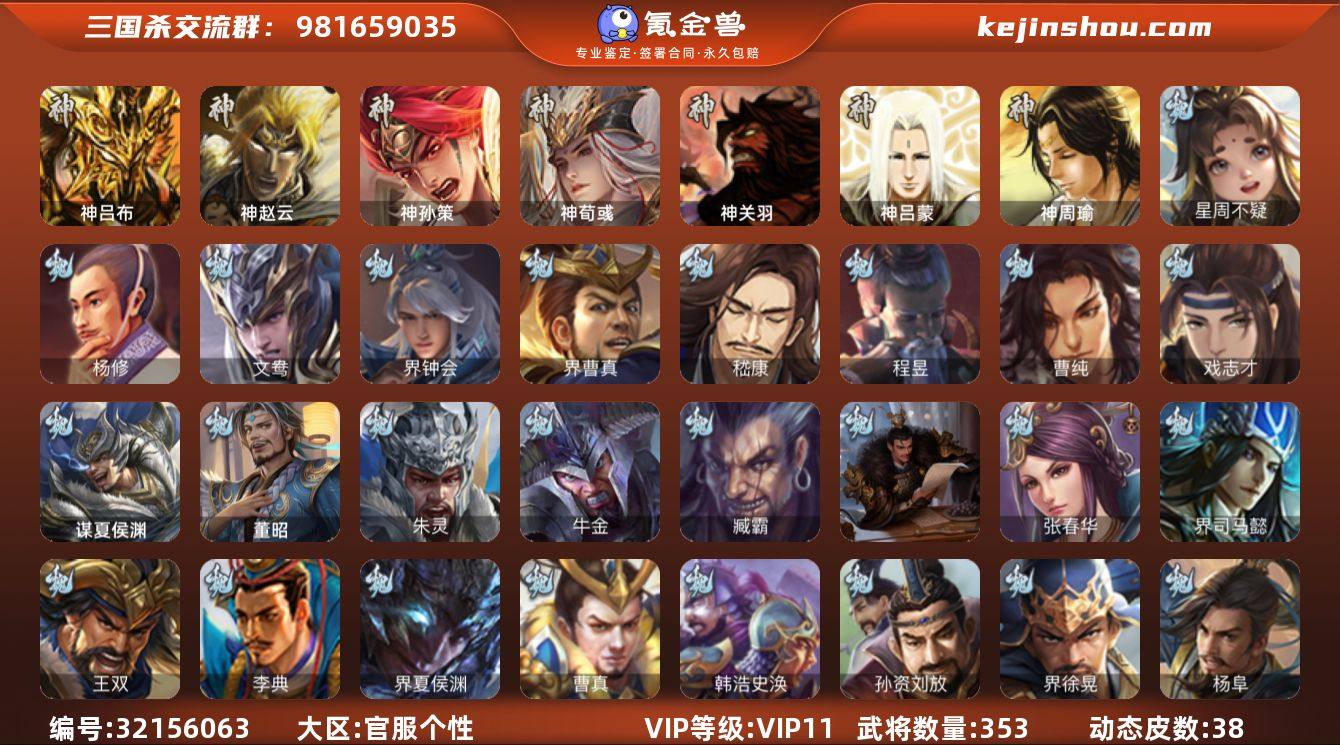 官阶: 大将军 VIP等级: VIP11 武将数量: 353 动态皮肤数量: 38 神将: 神吕布,神孙策,神荀彧,神赵云,神关羽,神吕蒙,神周瑜 魏国武将: 戏志才,曹纯,程昱,嵇康,界曹真,界钟会,文鸯,杨修,唐咨-魏,张辽,SP蔡文姬,SP关羽,SP贾诩,SP姜维,SP庞德,卞夫人,曹昂,曹操,曹冲,曹洪,曹丕,曹仁,曹叡,贾逵,王异,张恭,鲁芝,界满宠,曹休,界曹植,满宠,荀攸,王基,钟繇,郭嘉,牵招,荀彧,阮慧,杜畿,界郭嘉,崔琰,界曹丕,界荀彧,朱灵,吕虔,界王异,界许褚,界郭淮,华歆,陈群,界邓艾,界典韦,界曹休,谋甄姬,袁涣,李通,乐进,辛宪英,郭淮,界曹彰,郭皇后,夏侯惇,曹植,司马朗,谋于禁,界曹操,星周不疑,许褚,界张辽,谋徐晃,张郃,钟会,文聘,曹彰,界夏侯惇,诸葛诞,司马懿,甄姬,杨阜,界徐晃,徐晃,孙资刘放,韩浩史涣,曹真,典韦,界夏侯渊,夏侯渊,李典,于禁,王双,邓艾,界司马懿,张春华,孟达-魏,臧霸,牛金,朱灵(国战),董昭,谋夏侯渊 蜀国武将: 董允,花鬘,谯周,沙摩柯,王平,张星彩,赵襄,谋马超,谋赵云,马云騄,徐庶,杨仪,吕凯,界关羽,界诸葛亮,邓芝,界伊籍,费祎,界黄月英,界张嶷,赵云,张松,彭羕,李丰,界刘备,界刘禅,刘封,糜竺,蒋琬,谋庞统,黄月英,刘巴,关羽,王甫赵累,吴懿,祝融,张飞,黄皓,魏延,界周仓,界法正,糜夫人,界孟获,刘禅,界赵云,界姜维,关银屏,界祝融,SP孙尚香,SP徐庶,卧龙诸葛,宗预,周仓,简雍,界关兴张苞,诸葛亮,孙乾,界张飞,界卧龙诸葛,法正,界简雍,赵统赵广,界马岱,关平,马岱,界庞统,庞统,诸葛果,谋张飞,马谡,马超,廖化,关兴张苞,孟获,夏侯氏,姜维,黄忠,刘备,界马超,李严,马良,蒋琬费祎,刘谌,彭羕(国战),甘夫人,SP甘夫人 吴国武将: 贺齐,界徐盛,界朱然,留赞,周处,文鸯,潘濬,张温,周泰,全琮,吕蒙,诸葛恪,界孙尚香,界顾雍,大乔小乔,许贡,丁奉,谋吕蒙,周鲂,界全琮,孙茹,蒋钦,顾雍,界朱治,孙休,严畯,界孙权,孙翊,祖茂,濮阳兴,界虞翻,界吕蒙,界孙策,凌操,...