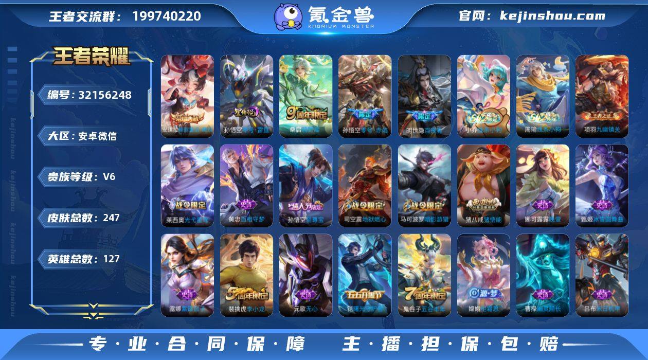 贵族6 荣耀典藏1 星元皮肤1 传说皮肤2 史诗皮肤51 皮肤数量247 皮肤价值:162368 英雄127 最强王者 总场次4322 最高段位荣耀王者52颗星 127个英雄,247个皮肤,荣耀典藏安琪拉:颠倒童话.魔镜,孙悟空零号赤焰,星传说:零号雷霆