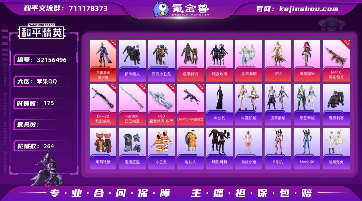 苹果 手Q-1神装-5粉装-8特效枪-0载具-5粉色飞行器-75342热力值-19王牌印记-175套装-264枪皮 【红色神装等级】:宇宙意志-塞卢姆(三级) 【红色角色神装】:宇宙意志-塞卢姆 【热门品类】:套装-都市猎人,套装-深海小丑鱼,套装-小丑鱼,套装-龟仙人,套装-暗影哥特,套装-粉红小猪,角色-8号机,角色-Mark.06 【粉色套装】:粉装-极限特训,粉装-暗夜玫瑰,粉装-金丰海韵,角色-罗征,角色-绯穹魔姬 【粉色枪皮等级】:M416-风花雪月(七级),ACE32-萌骑漫游(二级),UMP45-宇宙意志(三级),AKS-74U-森灵之息(五级),P90-魔童闹海 敖丙(三级),Kar98K-巳巳如意(五级),Mk14-福马献瑞(五级),DP-28-豹影疾电(五级) 【粉色枪皮】:M416-风花雪月,ACE32-萌骑漫游,UMP45-宇宙意志,AKS-74U-森灵之息,P90-魔童闹海 敖丙,Kar98K-巳巳如意,Mk14-福马献瑞,DP-28-豹影疾电 【粉色飞行器】:齐天大圣飞行器,深渊漩涡飞行器,智趣喵喵飞行器,飞天猪飞行器,灵珠游龙飞行器 【粉色降落伞】:绝对恒星降落伞,极限特训降落伞,春暖花开降落伞,暗星紫秘降落伞,碧影闪光降落伞,橘柚倾心降落伞,垂柳戏鸭降落伞,彩虹甜喵降落伞,天星战神降落伞,未来歌姬降落伞,圣堂之誓降落伞,宇宙意志降落伞,星穹咏叹调降落伞,幻彩电音降落伞,炫彩糖果降落伞 【稀有套装】:套装-龟仙人,套装-马上有钱,套装-雏菊兔兔,套装-萝兰蝴蝶,套装-小熊娃娃,角色-达芬奇,套装-燕燕于飞,套装-鱼渊荷华,角色-海琴烟,套装-星影赞美诗,套装-彩虹兔,套装-云朵鹅,套装-雪绒豹,套装-诡诞巡游,套装-蓝海鲸歌,套装-朱霞炽焰,套装-凌霄紫焰,套装-擎苍青焰,角色-申公豹,套装-雨过天青,套装-红釉青花,角色-霜纹水星 【稀有枪皮】:M79短管榴弹-钛晶裂爪,AKM-墨染幽兰,AKM-彩虹符号,AKM-影袭,AKM-灼热熔岩,AKM-生命誓言,AKM-...