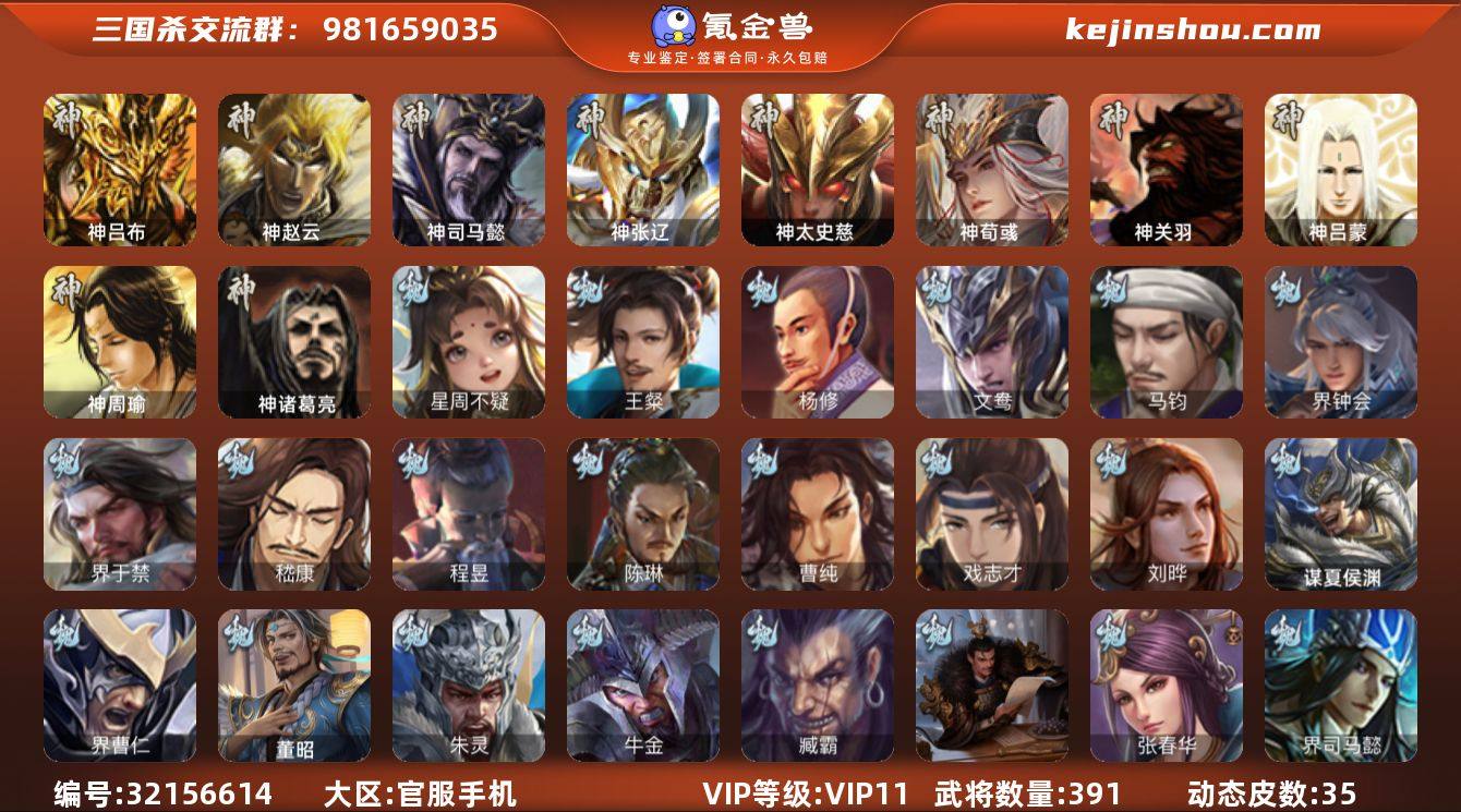 VIP等级: VIP11 官阶: 大将军 武将数量: 391 动态皮肤数量: 35 神将: 神吕布,神司马懿,神太史慈,神荀彧,神张辽,神赵云,神关羽,神吕蒙,神周瑜,神诸葛亮 魏国武将: 刘晔,戏志才,曹纯,陈琳,程昱,嵇康,界于禁,界钟会,马钧,文鸯,杨修,王粲,唐咨-魏,张辽,SP蔡文姬,SP曹仁,SP关羽,SP贾诩,SP姜维,SP庞德,卞夫人,曹昂,曹操,曹冲,曹洪,曹丕,曹仁,曹叡,王异,张恭,鲁芝,界满宠,曹休,界曹植,满宠,荀攸,王基,钟繇,蒯越蒯良,郭嘉,牵招,荀彧,阮慧,杜畿,界郭嘉,崔琰,界曹丕,界荀彧,朱灵,界甄姬,吕虔,界王异,界许褚,界郭淮,华歆,陈群,界邓艾,界典韦,袁涣,李通,乐进,辛宪英,郭淮,界曹彰,郭皇后,毌丘俭,夏侯惇,曹植,司马朗,谋于禁,界曹操,星周不疑,许褚,界张辽,谋徐晃,张郃,钟会,文聘,曹彰,界夏侯惇,诸葛诞,司马懿,甄姬,界徐晃,徐晃,界曹仁,孙资刘放,韩浩史涣,胡班,曹真,典韦,界夏侯渊,夏侯渊,李典,于禁,王双,邓艾,界司马懿,张春华,孟达-魏,臧霸,牛金,朱灵(国战),董昭,谋夏侯渊 蜀国武将: 董允,关索,界黄忠,谯周,沙摩柯,王平,张星彩,赵襄,诸葛瞻,谋马超,谋赵云,马云騄,徐庶,界魏延,杨仪,吕凯,界关羽,界诸葛亮,邓芝,界伊籍,胡金定,费祎,严颜,界黄月英,界张嶷,赵云,张松,彭羕,李丰,界刘备,界刘禅,刘封,糜竺,谋庞统,黄月英,关羽,王甫赵累,吴懿,界吴懿,界廖化,向宠,祝融,张飞,黄皓,陈震,魏延,马忠,界法正,糜夫人,界孟获,刘禅,界赵云,界姜维,张翼,关银屏,界祝融,SP孙尚香,SP徐庶,卧龙诸葛,宗预,周仓,简雍,界关兴张苞,诸葛亮,孙乾,界张飞,界卧龙诸葛,法正,界简雍,赵统赵广,陈到,界马岱,关平,马岱,界庞统,庞统,诸葛果,谋张飞,马谡,马超,廖化,关兴张苞,孟获,夏侯氏,姜维,黄忠,刘备,界马超,李严,马良,傅肜,蒋琬费祎,许靖,刘谌,彭羕(国战),甘夫人,SP甘夫人,势陈到,势陈祗 吴国武将: 贺齐,界徐盛,留赞,孙寒华,文鸯,潘濬,张温,周泰,全琮,吕蒙,SP庞...