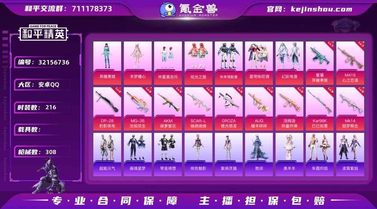 安卓 手Q-7粉装-14特效枪-0载具-3粉色飞行器-97652热力值-12王牌印记-216套装-308枪皮 【热门品类】:套装-浪漫天命,套装-小丑鱼,套装-龟仙人,套装-暗影哥特,套装-粉红小猪 【粉色套装】:粉装-仲夏莫吉托,粉装-炫光之旅,粉装-未来领航者,粉装-星穹咏叹调,粉装-幻彩电音,角色-羊梦糖心,角色-异瞳寒姬 【粉色枪皮等级】:AKM-绿萝繁花(五级),SCAR-L-锦绣绵绵(五级),M416-心之恋语(七级),GROZA-镜光银凌(五级),AUG-暖羊咩咩(五级),蜜獾-异瞳寒姬(七级),UMP45-萌骑冒险(五级),汤姆逊-热量炸弹(五级),AKS-74U-森灵之息(五级),Kar98K-巳巳如意(五级),Mk14-甜梦熊击(五级),Mk14-福马献瑞(二级),DP-28-豹影疾电(五级),MG-36-沧焰双生(五级) 【粉色枪皮】:AKM-绿萝繁花,SCAR-L-锦绣绵绵,M416-心之恋语,GROZA-镜光银凌,AUG-暖羊咩咩,蜜獾-异瞳寒姬,UMP45-萌骑冒险,汤姆逊-热量炸弹,AKS-74U-森灵之息,Kar98K-巳巳如意,Mk14-甜梦熊击,Mk14-福马献瑞,DP-28-豹影疾电,MG-36-沧焰双生 【粉色飞行器】:炫彩糖果飞行器,萌物绒绒飞行器,脆鲨七海飞行器 【粉色降落伞】:恐龙拽拽降落伞,庄周梦蝶降落伞,垂柳戏鸭降落伞,彩虹甜喵降落伞,旋转彩虹降落伞,青空秋雨降落伞,第五大道降落伞,莲影清波降落伞,圣堂之誓降落伞,精灵梦叶罗丽降落伞,创世·救赎降落伞,赛博古神降落伞,樱桃泡泡降落伞,星穹咏叹调降落伞,喜羊羊与灰太狼降落伞,异瞳寒姬降落伞,炫彩糖果降落伞,虹云熊熊降落伞,虎痴许褚降落伞 【稀有套装】:套装-龟仙人,套装-巳巳如意,套装-超能元气,套装-雪国风尚,套装-炫彩糖果,套装-马上来财,套装-糖糖葫芦,套装-青团波波,角色-摩登魅猫,角色-俏兔智灵,套装-燕燕于飞,套装-鱼渊荷华,套装-旋风灵鼠,套装-萌萌史莱姆,套装-粉恋花,套装-紫幽梦,套装-蓝冰...