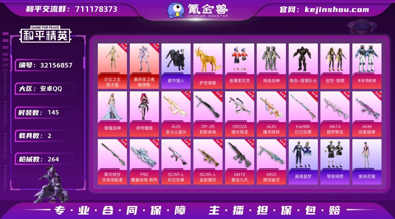 【特价出售/店主推荐】安卓 手Q-2神装-7粉装-16特效枪-2载具-10粉色飞行器-82536热力值-14王牌印记-145套装-264枪皮 【红色神装等级】:最终圣卫者-帕修斯(一级),沙丘之主-图卡盟(二级) 【红色角色神装】:最终圣卫者-帕修斯,沙丘之主-图卡盟 【热门品类】:粉装-音爆索尼克,套装-都市猎人,套装-龟仙人,套装-暗影哥特,角色-Mark.06 【粉色套装】:粉装-绚金战神,粉装-音爆索尼克,角色-猩猩队长,套装-创世·救赎,粉装-未来领航者,角色-智耀战神,角色-绯穹魔姬 【粉色枪皮等级】:AKM-炫紫旋律(四级),AKM-暮色玫影(三级),SCAR-L-时空协奏(三级),SCAR-L-金蛇镇世(三级),M416-墨龙九天(三级),GROZA-镜光银凌(五级),AUG-暖羊咩咩(五级),AUG-圣斗士星矢(七级),AKS-74U-森灵之息(五级),P90-魔童闹海 敖丙(三级),Kar98K-巳巳如意(五级),Mk14-甜梦熊击(五级),Mk14-福马献瑞(五级),莫辛纳甘-未来领航者(四级),DP-28-豹影疾电(五级),MG3-辉羽雀灵(三级) 【粉色载具】:法拉利Roma(纽博格林银),护世瑞兽 【粉色枪皮】:AKM-炫紫旋律,AKM-暮色玫影,SCAR-L-时空协奏,SCAR-L-金蛇镇世,M416-墨龙九天,GROZA-镜光银凌,AUG-暖羊咩咩,AUG-圣斗士星矢,AKS-74U-森灵之息,P90-魔童闹海 敖丙,Kar98K-巳巳如意,Mk14-甜梦熊击,Mk14-福马献瑞,莫辛纳甘-未来领航者,DP-28-豹影疾电,MG3-辉羽雀灵 【粉色飞行器】:酣梦熊熊飞行器,祥瑞起舞飞行器,沙丘之主天马,镜域双华-灵镜之阶,龙翔九天飞行器,万象金身飞行器,圣域金龙飞行器,终晖之翼飞行器,灵猫魔法师飞行器,灵珠游龙飞行器 【粉色降落伞】:幻影战神降落伞,彩虹甜喵降落伞,旋转彩虹降落伞,暗夜鎏金降落伞,飒粉甜心降落伞,沙丘之主降落伞,镜域双华降落伞,墨龙九天降落伞,星梦奇缘降落伞,忍者神龟降落伞,宇宙意志降落伞,拳...