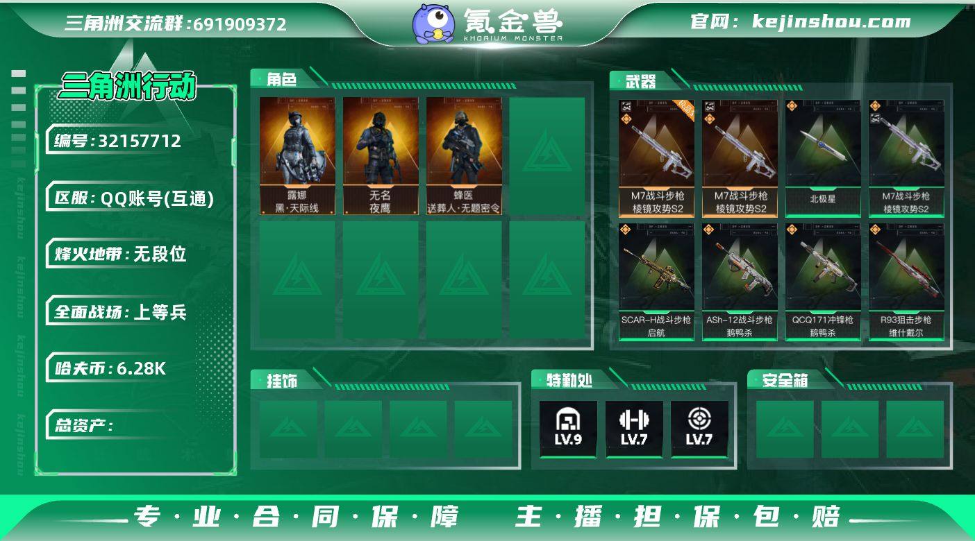 际线+北极星+M7战斗步枪-棱镜攻势S2(优品B).总资产265M】【无二次协助处理】z9008-特勤处:仓库9级/靶场7级/训练中心7级-265m总资产-628W哈伏币-60烽火等级-黄金-50战场等级-上等兵 【干员外观】:露娜-黑·天际线,蜂医-送葬人·无题密令,无名-夜鹰,深蓝-不破誓约,红狼-电锯惊魂 【近战皮肤】:近战-北极星,近战-黑鹰 【典藏外观】:M7战斗步枪-棱镜攻势S2 【典藏外观成色】:M7战斗步枪-棱镜攻势S2(优品B) 【传说外观】:M4A1突击步枪-阿米娅,ASh-12战斗步枪-鹅鸭杀,K416突击步枪-行动记录,SG552突击步枪-运动员,AK-12突击步枪-夜鹰,AK-12突击步枪-特斯拉线圈,SCAR-H战斗步枪-启航,SCAR-H战斗步枪-荼蘼,CAR-15突击步枪-黑鹰坠落,CAR-15突击步枪-阿米娅,腾龙突击步枪-捞点薯条,腾龙突击步枪-万金泪冠,K437突击步枪-北极星,KC17突击步枪-电锯惊魂,UZI冲锋枪-特斯拉线圈,SR-3M紧凑突击步枪-特斯拉线圈,SR-3M紧凑突击步枪-荼蘼,勇士冲锋枪-能天使-午夜邮差,勇士冲锋枪-万金泪冠,QCQ171冲锋枪-北极星,QCQ171冲锋枪-鹅鸭杀,725双管霰弹枪-送葬人-无题密令,PKM通用机枪-荼蘼,M250通用机枪-骑士之心,QJB201轻机枪-鹅鸭杀,M14射手步枪-缄花,SR-25射手步枪-缄花,R93狙击步枪-维什戴尔,AWM狙击步枪-捞点薯条,AWM狙击步枪-万金泪冠,.357左轮-缄花,93R-捞点薯条,复合弓-黑·天际线 【史诗外观】:AKM突击步枪-林中猎手,QBZ95-1突击步枪-曙光,ASh-12战斗步枪-守夜人,ASh-12战斗步枪-无极限,M16A4突击步枪-竞赛选手,AUG突击步枪-蝮蛇,SG552突击步枪-尖端治疗,SG552突击步枪-深海恐惧,SCAR-H战斗步枪-囚徒,G3战斗步枪-流沙送葬,PTR-32突击步枪-工业狂潮,AS Val突击步枪-尖端治疗,AS Val突击步枪-典狱官,AS Val突击步