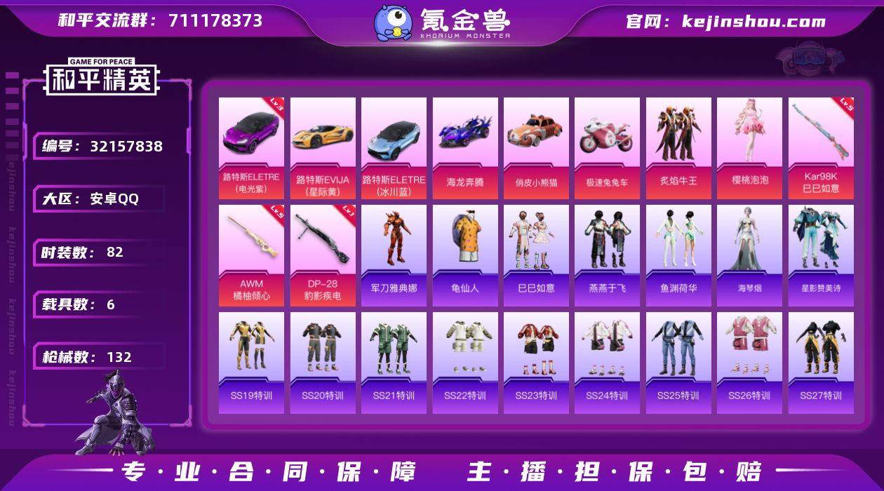 【kyhp956】安卓 手Q-2粉装-3特效枪-6载具-2粉色飞行器-48243热力值-7王牌印记-82套装-132枪皮 【红色载具】:路特斯ELETRE(电光紫)(三级) 【热门品类】:角色-军刀雅典娜,套装-龟仙人 【粉色套装】:粉装-炙焰牛王,角色-樱桃泡泡 【粉色枪皮等级】:Kar98K-巳巳如意(五级),AWM-橘柚倾心(五级),DP-28-豹影疾电(一级) 【粉色载具】:路特斯ELETRE(电光紫),路特斯EVIJA(星际黄),路特斯ELETRE(冰川蓝),海龙奔腾,俏皮小熊猫,极速兔兔车,僚机-萌兔起飞 【粉色枪皮】:Kar98K-巳巳如意,AWM-橘柚倾心,DP-28-豹影疾电 【粉色飞行器】:炫彩糖果飞行器,青春物语飞行器 【粉色降落伞】:暗星紫秘降落伞,碧影闪光降落伞,橘柚倾心降落伞,第五大道降落伞,时光之吻降落伞,炫彩糖果降落伞 【稀有套装】:套装-龟仙人,套装-巳巳如意,套装-炫彩糖果,套装-燕燕于飞,套装-鱼渊荷华,角色-海琴烟,套装-星影赞美诗 【稀有枪皮】:AKM-王牌投手,AKM-龙的传人,M16A4-幻世战舞者,M16A4-甜心亚梦,SCAR-L-玉兔迎春,SCAR-L-甜蜜誓约,SCAR-L-碧影闪光,SCAR-L-红色方程式,SCAR-L-冷漠罗丽,M416-紫翼圣骑,M416-红色方程式,M416-蓝色火焰,GROZA-异彩先驱,GROZA-懵萌河马,GROZA-紫翼圣骑,AUG-天降萌叽,AUG-幻梦音符,QBZ-飞驰魅影,M762-第五大道,Mk47-妙红点点,G36C-懵萌河马,G36C-炙焰牛王,AC-VAL-天降萌叽,AC-VAL-甜心亚梦,蜜獾-垂柳戏鸭,蜜獾-娇憨猪猪,UZI-啾咪啾咪,UZI-娇憨猪猪,UMP45-涂山之恋,UMP45-蓝色火焰,Vector-治愈之星,汤姆逊-天降萌叽,汤姆逊-异彩先驱,汤姆逊-樱桃泡泡,MP5K-异彩先驱,P90-飞驰魅影,P90-巳巳如意,Kar98K-飞驰魅影,M24-炫彩节奏,AWM-炙焰牛王,SKS-心之恋语,SKS-炫彩节奏,VSS-彩虹符号,VSS-碧影闪光,Mini14-异彩先驱,Mini14-海渊国主,Min...