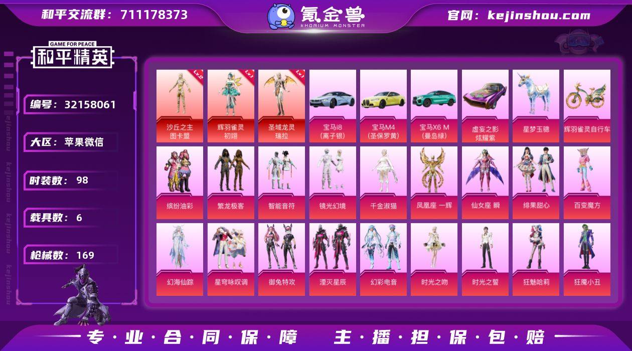苹果 微信 2级图卡盟! 瑞拉!初翊!6级AUG-星梦奇缘!! 3神装-22粉装-22特效枪-6载具-19粉色飞行器-77130热力值-5王牌印记-98套装-169枪皮 【红色神装等级】:辉羽雀灵-初翊(一级),圣域龙灵-瑞拉(一级),沙丘之主-图卡盟(二级) 【红色角色神装】:辉羽雀灵-初翊,圣域龙灵-瑞拉,沙丘之主-图卡盟 【热门品类】:粉装-缤纷油彩,粉装-繁龙极客 【粉色套装】:粉装-智能音符,粉装-缤纷油彩,粉装-镜光幻境,粉装-繁龙极客,角色-千金淑猫,角色-凤凰座 一辉,角色-仙女座 瞬,粉装-绯果甜心,粉装-百变魔方,角色-幻海仙踪,粉装-星穹咏叹调,粉装-御兔特攻,粉装-湮灭星辰,粉装-幻彩电音,角色-时光之吻,角色-时光之誓,角色-狂魅哈莉,角色-狂魇小丑,角色-宁雨蝶,角色-罗征,角色-罪夜之冕 【粉色枪皮等级】:AKM-幻海仙踪(七级),SCAR-L-青春物语(四级),M416-风花雪月(一级),M416-灵猫魔法师(六级),AUG-星梦奇缘(六级),AUG-圣斗士星矢(一级),ACE32-萌骑漫游(二级),Vector-最终圣卫者(二级),AKS-74U-星穹咏叹调(二级),AKS-74U-森灵之息(五级),P90-沙丘之主(四级),Kar98K-圣域龙灵(一级),AWM-湮灭星辰(一级),Mk14-福马献瑞(二级),M200-梦海之灵(二级),DP-28-千金淑猫(一级),DP-28-豹影疾电(四级),MG3-辉羽雀灵(四级),PKM-萌骑夺宝(二级),MG-36-幻彩电音(二级),烟雾弹-甜梦果泡(二级),破片手榴弹-瓶中星球(六级) 【粉色载具】:宝马i8(离子银),宝马M4(圣保罗黄),宝马X6 M(曼岛绿),虚妄之影(炫耀紫),僚机-圣域龙宝,星梦玉骢,辉羽雀灵自行车 【粉色枪皮】:AKM-幻海仙踪,SCAR-L-青春物语,M416-风花雪月,M416-灵猫魔法师,AUG-星梦奇缘,AUG-圣斗士星矢,ACE32-萌骑漫游,Vector-最终圣卫者,AKS-74U-星穹咏叹调,AKS-74U-森灵之息,P90-沙丘之主,Kar98K-圣域龙灵,AWM...