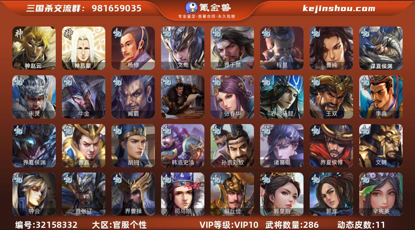 官阶: 骠骑将军 VIP等级: VIP10 武将数量: 286 动态皮肤数量: 11 神将: 神赵云,神吕蒙 魏国武将: 曹纯,程昱,界于禁,文鸯,杨修,张辽,SP蔡文姬,SP曹仁,SP关羽,SP贾诩,SP姜维,卞夫人,曹昂,曹操,曹冲,曹洪,曹丕,曹仁,曹叡,王异,鲁芝,曹休,界曹植,满宠,荀攸,钟繇,郭嘉,荀彧,阮慧,杜畿,界郭嘉,界曹丕,朱灵,吕虔,界王异,界许褚,界郭淮,陈群,界邓艾,袁涣,乐进,辛宪英,郭淮,郭皇后,毌丘俭,夏侯惇,曹植,司马朗,谋于禁,界曹操,许褚,界张辽,张郃,钟会,文聘,曹彰,界夏侯惇,诸葛诞,司马懿,甄姬,徐晃,孙资刘放,韩浩史涣,胡班,曹真,典韦,界夏侯渊,夏侯渊,李典,于禁,王双,邓艾,界司马懿,张春华,孟达-魏,臧霸,牛金,朱灵(国战),谋夏侯渊 蜀国武将: 花鬘,谯周,谋马超,谋赵云,谋夏侯氏,徐庶,界魏延,界关羽,邓芝,界伊籍,界黄月英,界张嶷,赵云,张松,彭羕,界刘备,刘封,糜竺,黄月英,关羽,吴懿,吴班,界廖化,祝融,张飞,黄皓,魏延,界周仓,谋祝融,马忠,界法正,刘禅,界赵云,张翼,关银屏,SP孙尚香,SP徐庶,卧龙诸葛,周仓,简雍,界关兴张苞,诸葛亮,界张飞,法正,界简雍,赵统赵广,陈到,界马岱,关平,马岱,庞统,诸葛果,谋张飞,马谡,马超,廖化,关兴张苞,孟获,夏侯氏,姜维,黄忠,刘备,界马超,马良,蒋琬费祎,刘谌,彭羕(国战),甘夫人 吴国武将: 界徐盛,文鸯,潘濬,张温,周泰,全琮,吕蒙,诸葛恪,界孙尚香,大乔小乔,丁奉,谋吕蒙,周鲂,孙茹,蒋钦,顾雍,孙亮,孙休,严畯,界孙权,界凌统,濮阳兴,界吕蒙,凌操,朱治,谋黄盖,孙尚香,程普,大乔,韩当,陆逊,诸葛瑾,朱然,吕范,太史慈,谋大乔,周妃,虞翻,界黄盖,孙鲁班,界周瑜,界潘璋马忠,孙权,界小乔,界甘宁,吴国太,甘宁,界大乔,孙坚,孙鲁育,凌统,岑昏,步练师,周瑜,小乔,潘璋马忠,黄盖,孙策,界陆逊,界周泰,界吴国太,谋韩当,徐盛,张昭张纮,孙邵,朱桓,吴珂 群国武将: 沮授,麹义,兀突骨,左慈,伏完,刘协,华雄,董白,袁术,高顺,界庞德,...