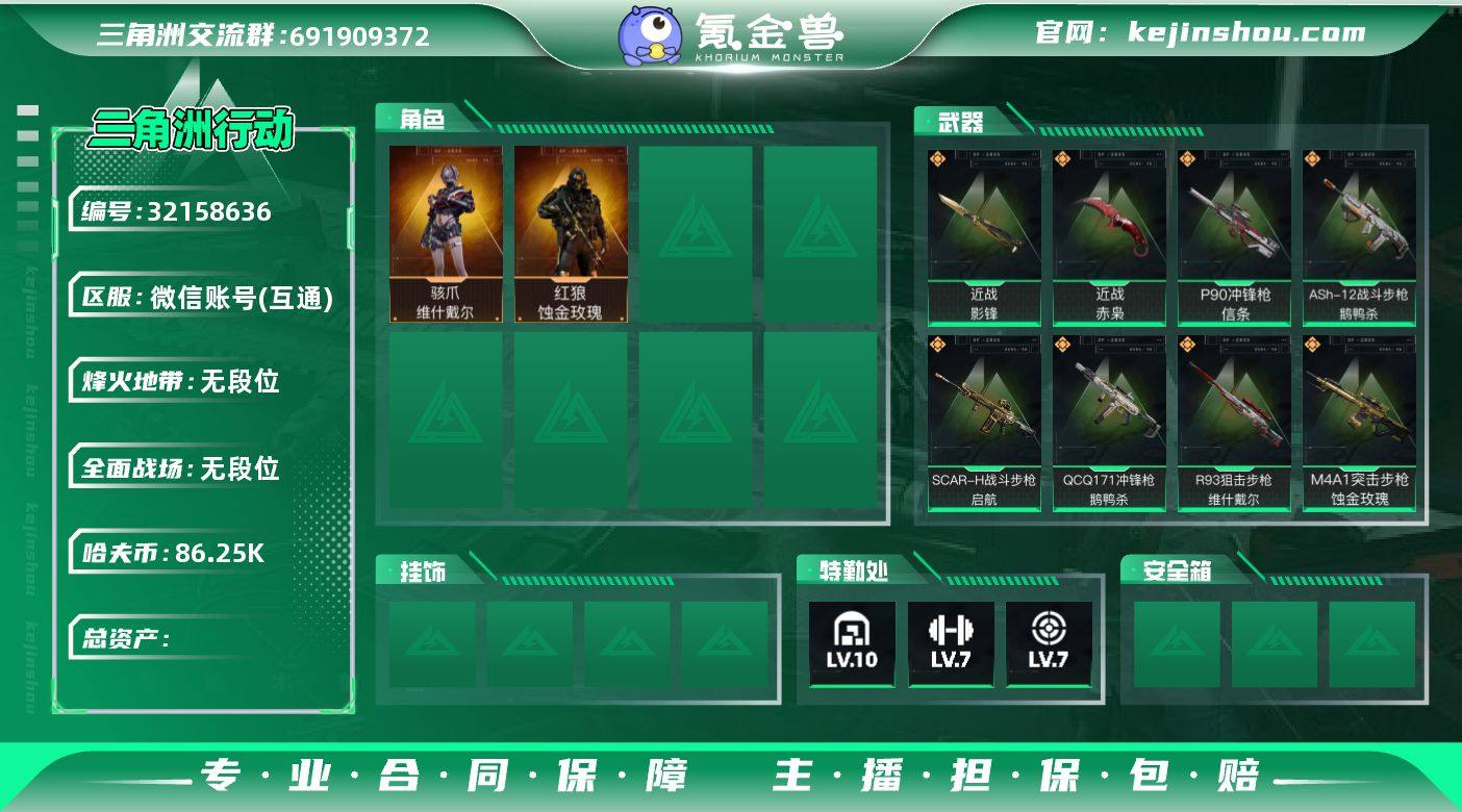 【SJ8404】总资产(M):574M/哈夫币(K):86251K/哈夫币(K):86251K/传说枪皮数:16/全面战场等级:1_段位:无段位/烽火地带等级:60_段位:钻石/红狼-蚀金玫瑰/骇爪-维什戴尔/威龙-凌霄戍卫/红狼-电锯惊魂/露娜-金牌射手/近战-信条/影锋/近战-赤枭/黑鹰/M4A1突击步枪-蚀金玫瑰/QBZ95-1突击步枪-凌霄戍卫/ASh-12战斗步枪-鹅鸭杀/SG552突击步枪-运动员/SCAR-H战斗步枪-启航/KC17突击步枪-电锯惊魂/P90冲锋枪-信条/QCQ171冲锋枪-鹅鸭杀/M250通用机枪-骑士之心/QJB201轻机枪-鹅鸭杀/M14射手步枪-缄花/SKS射手步枪-骑士/SR-25射手步枪-信条/SR-25射手步枪-缄花/R93狙击步枪-维什戴尔/.357左轮-缄花/KC17突击步枪-碎冰行动/ASh-12战斗步枪-无极限/K416突击步枪-冬日风情/M7战斗步枪-百步穿杨/G3战斗步枪-流沙送葬/AS Val突击步枪-百步穿杨/K437突击步枪-守护者/MP5冲锋枪-战术竞备/MP5冲锋枪-竞技风/Vector冲锋枪-百步穿杨/勇士冲锋枪-工业狂潮/MP7冲锋枪-守护者/MP7冲锋枪-六套之力/PKM通用机枪-蝮蛇/M250通用机枪-囚徒/QJB201轻机枪-炽焰/Mini-14射手步枪-守护者/M14射手步枪-工业狂潮/M700狙击步枪-百步穿杨/AWM狙击步枪-无极限/AWM狙击步枪-流沙送葬/复合弓-守护者/UZI冲锋枪-旧梦/M14射手步枪-巨兽/K437突击步枪-巨兽/QJB201轻机枪-千里骏骨/M4A1突击步枪-繁盛/AKM突击步枪-战术演练/AKM突击步枪-肃杀/QBZ95-1突击步枪-公平竞技/ASh-12战斗步枪-繁盛/K416突击步枪-一帆风顺/M7战斗步枪-捣蛋鬼/SG552突击步枪-2026/SG552突击步枪-贴花艺术/SCAR-H战斗步枪-荣耀列队/SCAR-H战斗步枪-黄昏/G3战斗步枪-战术演练/G3战斗步枪-主宰/腾龙突击步枪-冰天雪地/MP5冲锋枪-弄臣/P90冲锋枪-黄