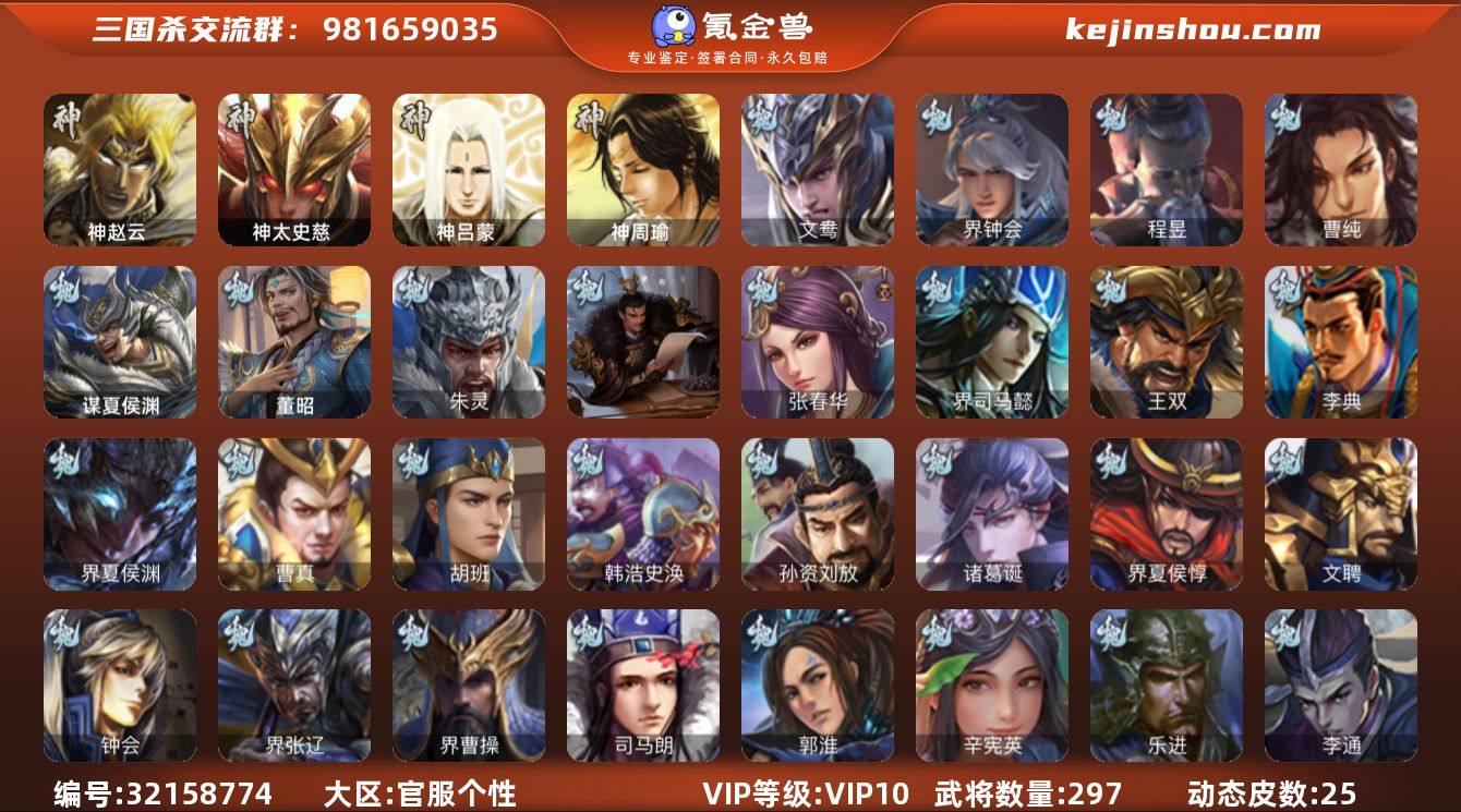 官阶: 骠骑将军 VIP等级: VIP10 武将数量: 297 动态皮肤数量: 25 神将: 神太史慈,神赵云,神吕蒙,神周瑜 魏国武将: 曹纯,程昱,界钟会,文鸯,唐咨-魏,张辽,SP蔡文姬,SP关羽,SP姜维,SP庞德,卞夫人,曹昂,曹操,曹冲,曹洪,曹丕,曹仁,曹叡,王异,张恭,鲁芝,曹休,界曹植,满宠,荀攸,钟繇,蒯越蒯良,郭嘉,荀彧,阮慧,杜畿,界郭嘉,崔琰,界荀彧,朱灵,吕虔,界王异,界许褚,界郭淮,陈群,界邓艾,袁涣,李通,乐进,辛宪英,郭淮,夏侯惇,曹植,司马朗,谋于禁,界曹操,许褚,界张辽,谋徐晃,张郃,钟会,文聘,曹彰,界夏侯惇,诸葛诞,司马懿,甄姬,徐晃,孙资刘放,韩浩史涣,胡班,曹真,典韦,界夏侯渊,夏侯渊,李典,于禁,王双,邓艾,界司马懿,张春华,孟达-魏,朱灵(国战),董昭,谋夏侯渊 蜀国武将: 花鬘,张星彩,赵襄,谋马超,谋赵云,谋夏侯氏,徐庶,界关羽,界伊籍,费祎,严颜,赵云,张松,彭羕,李丰,界刘备,刘封,糜竺,谋庞统,黄月英,刘巴,关羽,王甫赵累,吴懿,吴班,祝融,张飞,黄皓,魏延,界周仓,马忠,界法正,糜夫人,刘禅,界赵云,关银屏,SP孙尚香,SP徐庶,卧龙诸葛,周仓,简雍,界关兴张苞,诸葛亮,界张飞,界卧龙诸葛,法正,界马岱,关平,马岱,界庞统,庞统,诸葛果,谋张飞,马谡,马超,廖化,关兴张苞,孟获,夏侯氏,姜维,黄忠,刘备,界马超,李严,马良,傅肜,蒋琬费祎,刘谌,彭羕(国战),甘夫人,蜀-糜芳傅士仁 吴国武将: 界徐盛,骆统,周处,文鸯,周泰,全琮,吕蒙,诸葛恪,界孙尚香,界顾雍,大乔小乔,界程普,丁奉,谋吕蒙,界全琮,孙茹,蒋钦,顾雍,界朱治,孙休,严畯,界孙权,界凌统,濮阳兴,界虞翻,界吕蒙,孙登,界孙策,凌操,谋黄盖,孙尚香,程普,大乔,韩当,陆逊,诸葛瑾,朱然,吕范,太史慈,虞翻,界黄盖,孙鲁班,界周瑜,卫温诸葛直,孙权,界小乔,界甘宁,吴国太,甘宁,界大乔,孙坚,孙鲁育,凌统,岑昏,步练师,周瑜,小乔,潘璋马忠,黄盖,吕岱,孙策,界陆逊,界周泰,界吴国太,吴-唐咨,徐盛,张昭张纮,陈武蕫袭,界...