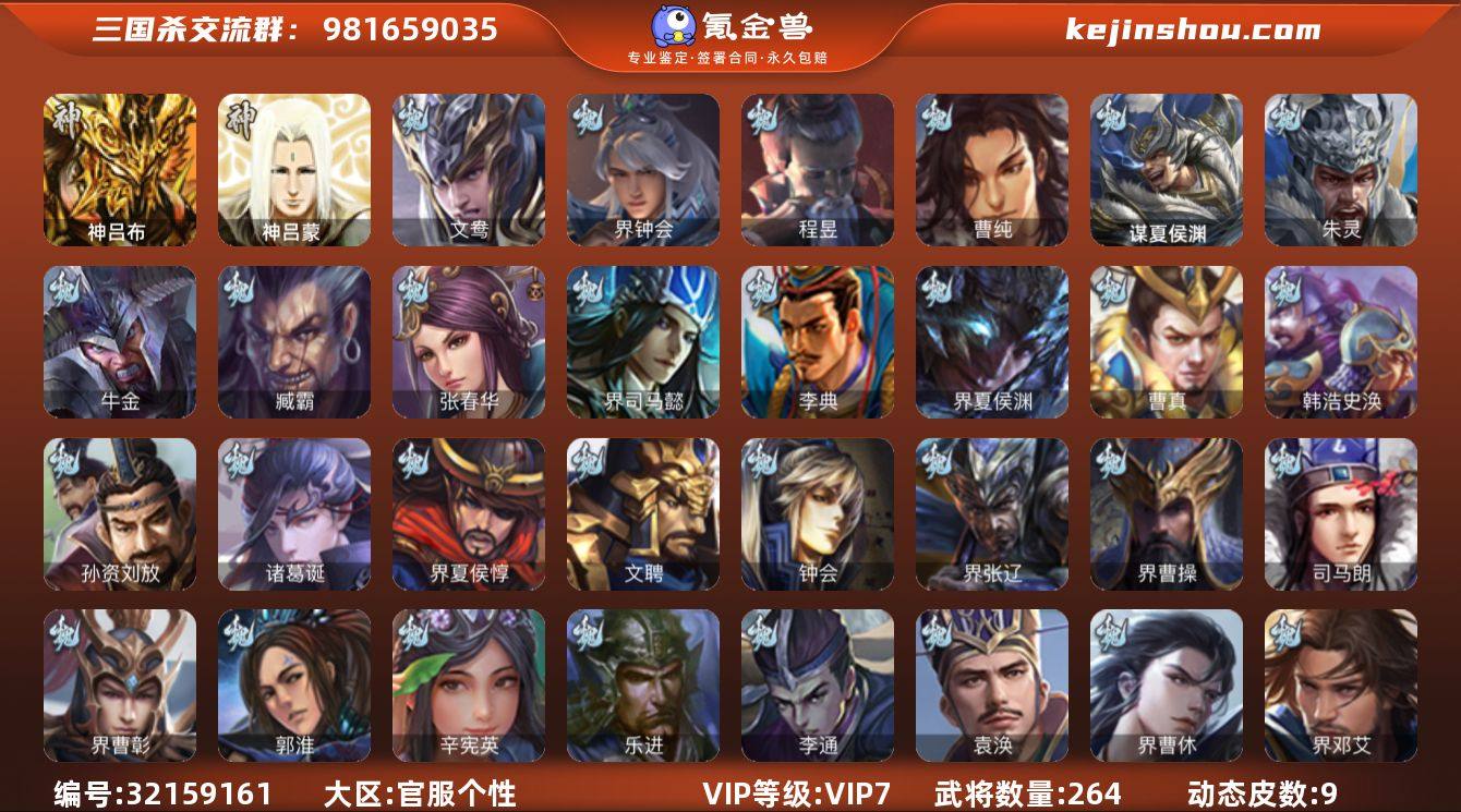 官阶: 骠骑将军 VIP等级: VIP7 武将数量: 264 动态皮肤数量: 9 神将: 神吕布,神吕蒙 魏国武将: 曹纯,程昱,界钟会,文鸯,张辽,SP蔡文姬,SP关羽,SP贾诩,SP姜维,卞夫人,曹昂,曹操,曹冲,曹洪,曹丕,曹仁,曹叡,王异,鲁芝,界满宠,满宠,荀攸,王基,钟繇,郭嘉,荀彧,杜畿,界郭嘉,崔琰,界曹丕,界荀彧,朱灵,界王异,界许褚,陈群,界邓艾,界曹休,袁涣,李通,乐进,辛宪英,郭淮,界曹彰,夏侯惇,曹植,司马朗,谋于禁,界曹操,许褚,界张辽,谋徐晃,张郃,钟会,文聘,曹彰,界夏侯惇,诸葛诞,司马懿,甄姬,徐晃,孙资刘放,韩浩史涣,曹真,典韦,界夏侯渊,夏侯渊,李典,于禁,邓艾,界司马懿,张春华,臧霸,牛金,朱灵(国战),谋夏侯渊 蜀国武将: 花鬘,张星彩,谋赵云,徐庶,界关羽,费祎,界张嶷,赵云,张松,李丰,界刘备,谋姜维,刘封,糜竺,黄月英,刘巴,关羽,王甫赵累,吴懿,吴班,祝融,张飞,黄皓,陈震,魏延,界周仓,马忠,界法正,刘禅,界赵云,关银屏,SP孙尚香,SP徐庶,卧龙诸葛,周仓,界关兴张苞,诸葛亮,界卧龙诸葛,法正,界简雍,赵统赵广,界马岱,关平,马岱,界庞统,庞统,诸葛果,谋张飞,马谡,马超,廖化,关兴张苞,孟获,夏侯氏,姜维,黄忠,刘备,李严,马良,蒋琬费祎,甘夫人,势陈祗 吴国武将: 界徐盛,文鸯,张温,周泰,全琮,吕蒙,SP庞统,诸葛恪,界孙尚香,界程普,丁奉,谋吕蒙,周鲂,孙茹,蒋钦,顾雍,孙亮,界朱治,严畯,界孙权,祖茂,界吕蒙,孙登,凌操,孙尚香,程普,大乔,韩当,陆逊,诸葛瑾,太史慈,周妃,虞翻,界黄盖,孙鲁班,界周瑜,孙权,鲁肃,界甘宁,界韩当,吴国太,甘宁,界大乔,孙坚,孙鲁育,凌统,周瑜,小乔,潘璋马忠,黄盖,吕岱,孙策,界陆逊,界周泰,徐盛,张昭张纮,孙邵,朱桓 群国武将: 沮授,麹义,兀突骨,许攸,左慈,伏完,刘协,界华雄,蔡文姬,华雄,董白,刘琦,袁术,高顺,于吉,界公孙瓒,吕布,张梁,星徐晃,李儒,界貂蝉,公孙瓒,胡车儿,蔡夫人,界刘表,樊稠,界张角,星张郃,潘凤,界袁术,陈宫,SP马超,...