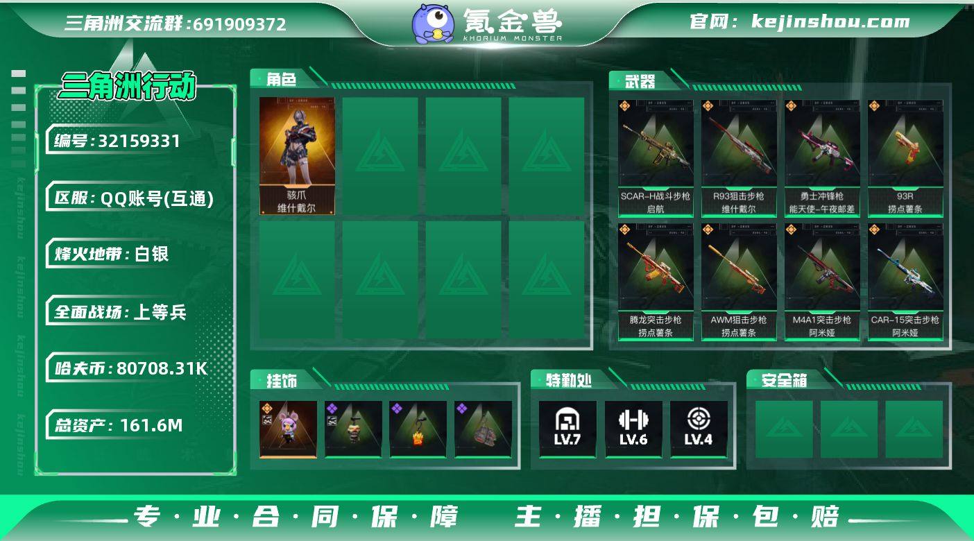 80780k哈夫币,160.5m仓库价值 仓库7级,指挥5级,训练6级,靶场4级,潜水1级,收藏0级 骇爪联动红皮 有部分枪皮