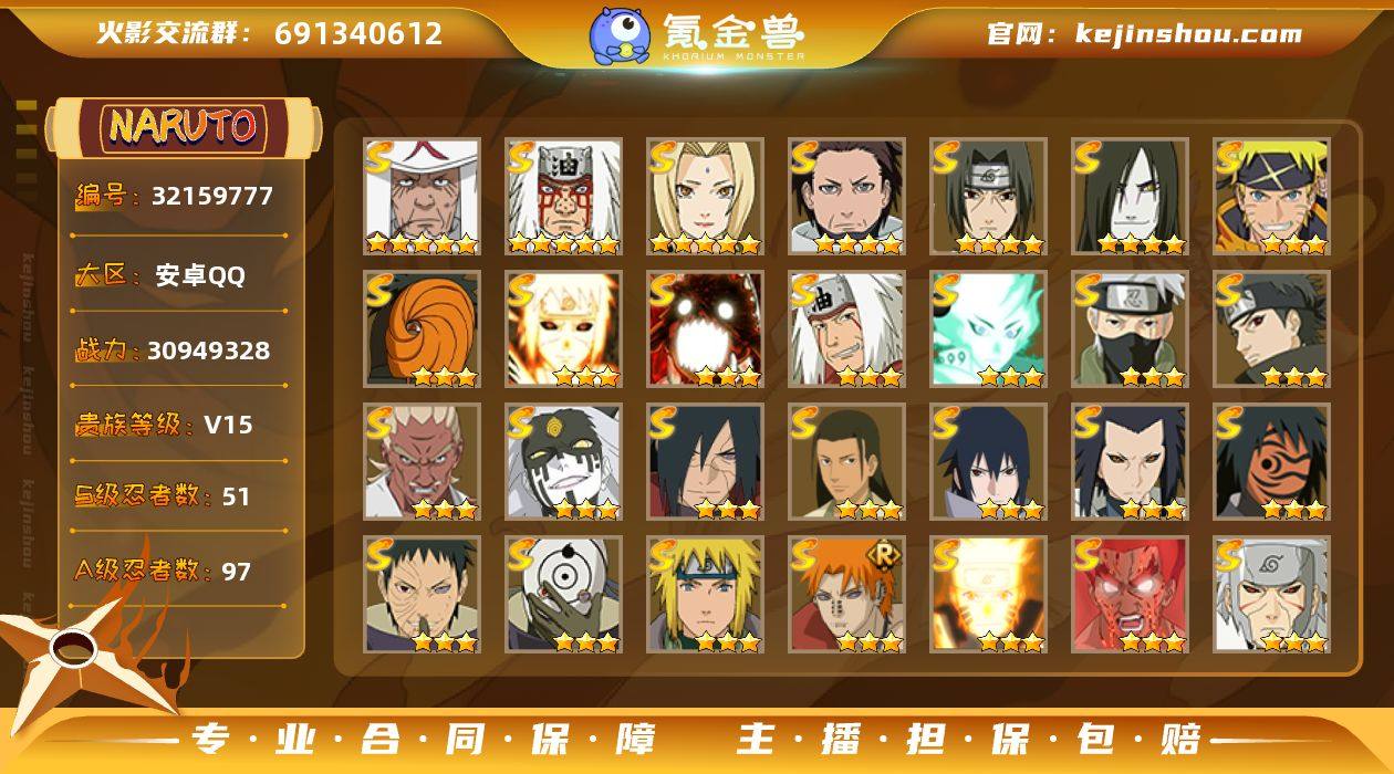 390忍,通灵兽50个,金银角86片,百豪纲手83片,十尾带土68片,神驹斑做任务就行,差3个氪金A,其余大都差b忍全都能免费出,月球主场景】VIP15,3097W战力,本服排名3战区15,本服1组战区2组,金币24000,高招券70
