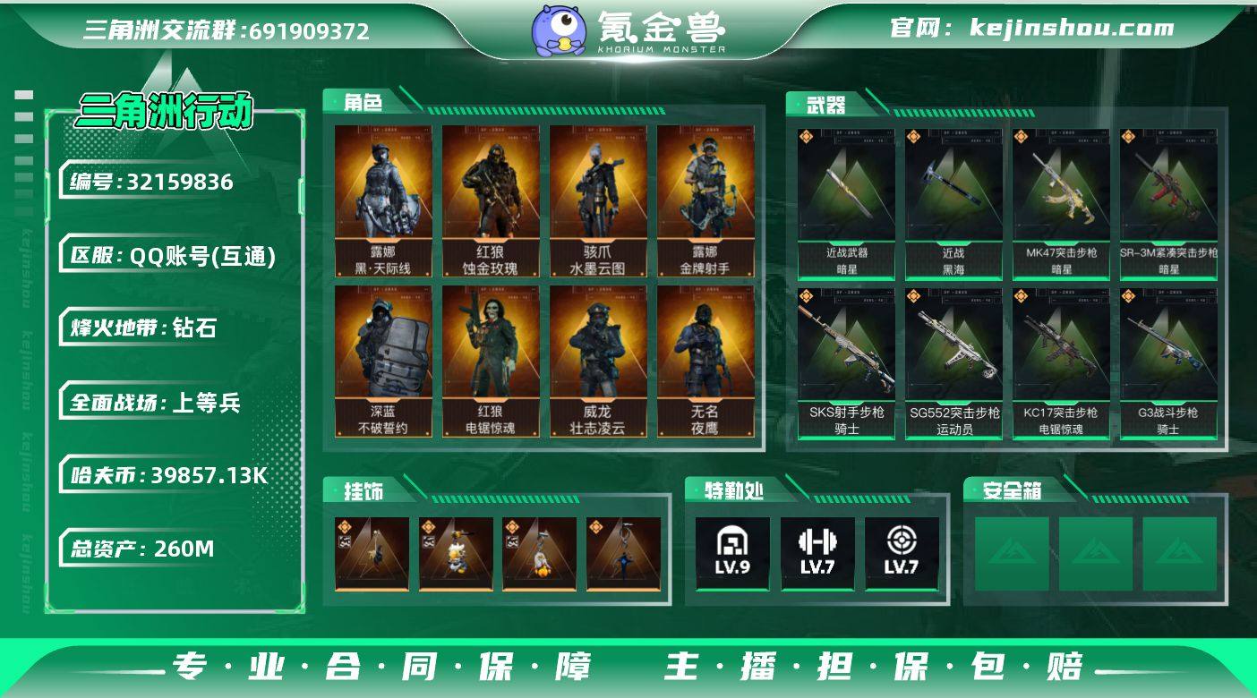 实名:可二次实名 总资产:260M 哈夫币:39857.13K 烽火地带段位:钻石 烽火地带等级:60 全面战场段位:上等兵 全面战场等级:22 9级仓库,7级训练中心,7级靶场,6级指挥中心,2级潜水中心,3级防具台,3级工作台,3级制药台,3级技术中心,1级收藏室 战术部门等级:3 战斗部门等级:3 医疗部门等级:3 研发部门等级:3 后勤部门等级:4 曼德尔砖-气象感应:0 曼德尔砖-命运王牌:0 曼德尔砖-电玩高手:0 曼德尔砖-美杜莎:0