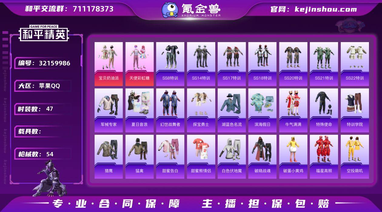 苹果 【小号宝贝奶油派 天使彩虹糖】手Q-2粉装-0特效枪-0载具-0粉色飞行器-14827热力值-4王牌印记-47套装-54枪皮 【粉色套装】:粉装-宝贝奶油派,粉装-天使彩虹糖 【稀有枪皮】:AKM-彩虹符号,AKM-海渊国主,AKM-生命誓言,AKM-虎虎生威,M16A4-幻世战舞者,M16A4-红色方程式,SCAR-L-玉兔迎春,SCAR-L-黄金龙骨,M416-夜灯,M416-神秘黑猫,M416-红色方程式,AUG-耀粉歌者,M762-瑞龙福将,Mk47-洛神天依,AC-VAL-天降萌叽,蜜獾-娇憨猪猪,UZI-娇憨猪猪,UZI-炫彩节奏,UMP45-诡娃娃,Vector-暗夜玫瑰,汤姆逊-奇异狩猎者,汤姆逊-炫彩节奏,汤姆逊-耀粉歌者,Kar98K-彩虹符号,M24-奇异狩猎者,AWM-王牌四分卫,Mini14-炫彩节奏,Mini14-耀粉歌者,Win94-瑞龙福将,SLR-娇憨猪猪,AMR-暗夜行者,S1897-炫彩节奏,S1897-神秘黑猫,S12K-瑞龙福将,S12K-娇憨猪猪,S12K-幻世战舞者,M249-糯团青竹,DP-28-彩虹符号,DP-28-清新柠檬,MG3-幻世战舞者,MG3-瑞龙福将 【其他套装】:套装-SS8特训,套装-SS14特训,套装-SS17特训,套装-SS18特训,套装-SS20特训,套装-SS21特训,套装-SS22特训,套装-军械专家,套装-夏日音浪,套装-幻世战舞者,套装-探宝勇士,套装-湖蓝色名流,套装-滨海假日,套装-牛气满满,套装-特殊使命,套装-特训学院,套装-猎鹰,套装-猛禽,套装-甜蜜告白,套装-甜蜜熊情侣,套装-白色伏地魔,套装-破晓战魂,套装-破蛋小黄鸡,套装-福星高照,套装-空投萌叽,套装-竞技名士,套装-红色运动,套装-绮丽涂鸦,套装-耀粉歌者,套装-虎虎生威吉莉,套装-长空猛禽,套装-霓虹街区,套装-魅力单车,套装-麻辣教官,套装-黑色伏地魔,套装-漫步者,套装-淡雅花蕊,角色-迪迦奥特曼,套装-瑞龙福将,套装-团圆交子,套装-电音精灵,套装-娇憨猪猪,套装-萌趣咩咩 【稀有头盔】:甜心宝贝头盔(2...