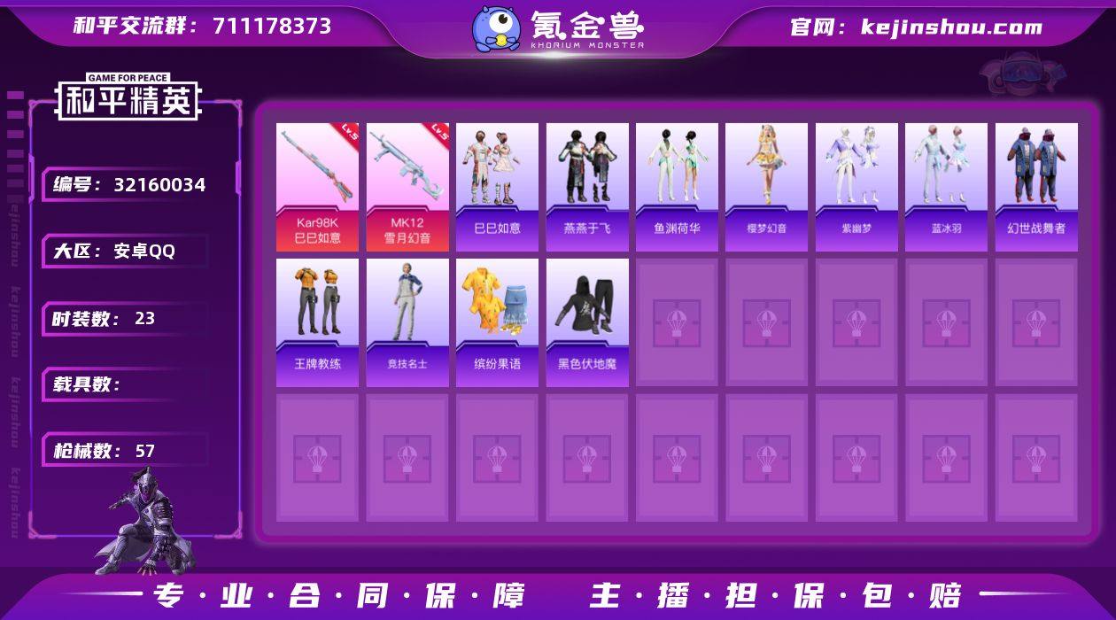 安卓 手Q-0粉装-2特效枪-0载具-0粉色飞行器-14508热力值-1王牌印记-23套装-57枪皮 【粉色枪皮等级】:Kar98K-巳巳如意(五级),MK12-雪月幻音(五级) 【粉色枪皮】:Kar98K-巳巳如意,MK12-雪月幻音 【粉色降落伞】:精灵梦叶罗丽降落伞,炫彩糖果降落伞 【稀有套装】:套装-巳巳如意,套装-雪国风尚,套装-燕燕于飞,套装-鱼渊荷华,套装-樱梦幻音,套装-紫幽梦,套装-蓝冰羽 【稀有枪皮】:AUG-冰晶雪宝,SCAR-L-夜灯,M416-蓝色火焰,AUG-耀粉歌者,M762-天降萌叽,AC-VAL-天降萌叽,AKS-74U-鬼刀,P90-巳巳如意,SKS-炫彩节奏,AMR-鬼刀,S686-生命誓言,S686-雪月幻音,S686-巳巳如意,S12K-玩趣呆呆,MG3-幻世战舞者,MG3-智耀战神,短管霰弹-竹节火铳,短管霰弹-星穹咏叹调,大砍刀-鬼刀,破片手榴弹-巳巳如意 【其他套装】:套装-幻世战舞者,套装-王牌教练,套装-竞技名士,套装-缤纷果语,套装-黑色伏地魔 【营地ID】:966274700
