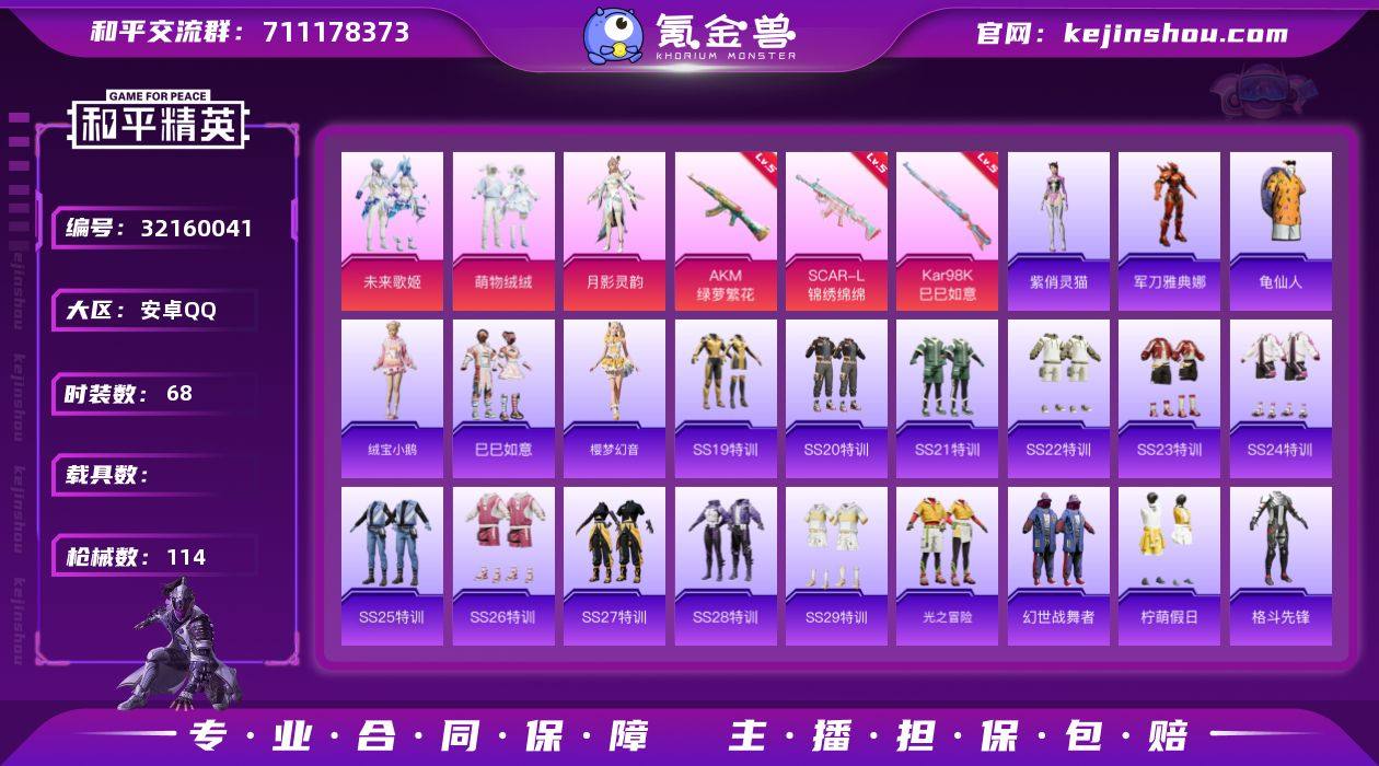 安卓【小号 角色-军刀雅典娜 套装-龟仙人 AKM-绿萝繁花(五级) SCAR-L-锦绣绵绵(五级)】 手Q-3粉装-3特效枪-0载具-1粉色飞行器-31523热力值-1王牌印记-68套装-114枪皮 【热门品类】:角色-军刀雅典娜,套装-龟仙人 【粉色套装】:粉装-未来歌姬,粉装-萌物绒绒,角色-月影灵韵 【粉色枪皮等级】:AKM-绿萝繁花(五级),SCAR-L-锦绣绵绵(五级),Kar98K-巳巳如意(五级) 【粉色枪皮】:AKM-绿萝繁花,SCAR-L-锦绣绵绵,Kar98K-巳巳如意 【粉色飞行器】:歌者泠鸢飞行器 【粉色降落伞】:纯梦嫁纱降落伞,闲梦青缨降落伞,精灵梦叶罗丽降落伞,星穹咏叹调降落伞 【稀有套装】:套装-龟仙人,套装-绒宝小鹅,套装-巳巳如意,套装-樱梦幻音,角色-紫俏灵猫 【稀有枪皮】:AKM-彩虹符号,AKM-灼热熔岩,AKM-霓虹街区,AKM-龙的传人,M16A4-天使羽翼,M16A4-幻世战舞者,M16A4-红色方程式,M16A4-莲影清波,SCAR-L-是爱神辣,SCAR-L-炫彩节奏,SCAR-L-玉兔迎春,SCAR-L-红色方程式,SCAR-L-冷漠罗丽,M416-暗夜行者,M416-糯团青竹,M416-红色方程式,M416-绿野极光,GROZA-恐龙拽拽,AUG-耀粉歌者,QBZ-彩虹符号,QBZ-飞驰魅影,M762-天降萌叽,AC-VAL-天降萌叽,AC-VAL-快闪甜心,蜜獾-天降萌叽,UZI-墨染幽兰,UZI-天降萌叽,UZI-红色方程式,UMP45-生命誓言,UMP45-蓝色火焰,UMP45-绒宝小鹅,Vector-生命誓言,汤姆逊-天降萌叽,P90-快闪甜心,P90-飞驰魅影,P90-巳巳如意,Kar98K-炫彩节奏,Kar98K-飞驰魅影,Kar98K-星穹咏叹调,M24-炫彩节奏,AWM-音爆索尼克,SKS-糯团青竹,Mini14-彩虹嘻嘻猴,Mini14-耀粉歌者,Mk14-魔药课室,SLR-彩虹符号,M417-星兔领航员,MK20-H-快闪甜心,M200-仲夏莫吉托,S686-彩虹符号,S686-生命誓言,S686-红色方程式,S1897-暗夜鎏金,S1897-炫彩节奏,S1897-飞驰魅影,S12K-玩趣呆呆...