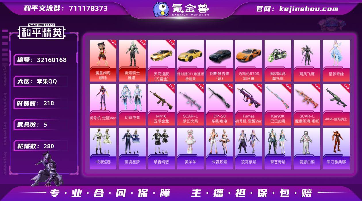 苹果 【神装号 天马凌跃(闪耀金)(二级)/魔童闹海-哪吒(三级)/幽焰骑士-维塔(二级)/绝对防御上衣/Mark.06/初号机 觉醒Ver/AKM-幽焰骑士(三级)/SCAR-L-梦幻火箭(六级)/SCAR-L-魔童闹海 哪吒(三级)/8M416-五爪金龙(七级)/阿斯顿马丁DBX(蓝)/迈凯伦570S(旭日黄)】手Q-2神装-5粉装-8特效枪-5载具-5粉色飞行器-97024热力值-17王牌印记-218套装-280枪皮 【红色载具】:天马凌跃(闪耀金)(二级) 【红色神装等级】:魔童闹海-哪吒(三级),幽焰骑士-维塔(二级) 【红色角色神装】:魔童闹海-哪吒,幽焰骑士-维塔 【热门品类】:绝对防御上衣,角色-军刀雅典娜,套装-金羽特工,套装-SS1特训,套装-粉红小猪,角色-8号机,角色-Mark.06,角色-六号稻草人 【粉色套装】:粉装-飓风飞鹰,角色-星梦奇缘,角色-初号机 觉醒Ver.,粉装-幻彩电音,角色-罪夜之冕 【粉色枪皮等级】:AKM-幽焰骑士(三级),SCAR-L-梦幻火箭(六级),SCAR-L-魔童闹海 哪吒(三级),M416-五爪金龙(七级),Famas-初号机 觉醒Ver.(五级),Kar98K-巳巳如意(五级),DP-28-豹影疾电(五级) 【粉色载具】:阿斯顿马丁DBX(蓝),迈凯伦570S(旭日黄),天马凌跃(闪耀金),保时捷911 敞篷版(极速黄),幽焰风驰摩托车 【粉色枪皮】:AKM-幽焰骑士,SCAR-L-梦幻火箭,SCAR-L-魔童闹海 哪吒,M416-五爪金龙,Famas-初号机 觉醒Ver.,Kar98K-巳巳如意,DP-28-豹影疾电 【粉色飞行器】:炫彩糖果飞行器,梦幻火箭飞行器,幽焰列车飞行器,万象金身飞行器,飞天猪飞行器 【粉色降落伞】:银河战甲降落伞,梦幻火箭降落伞,夏日绵绵冰降落伞,荒漠赏金降落伞,未来歌姬降落伞,初号机 觉醒Ver.降落伞,宇宙意志降落伞,幽焰骑士降落伞,幻彩电音降落伞,时光之吻降落伞,双重狂想降落伞,魔童闹海 哪吒降落伞,异瞳寒姬降落伞,炫彩糖果降落伞,罪夜之冕降落伞...