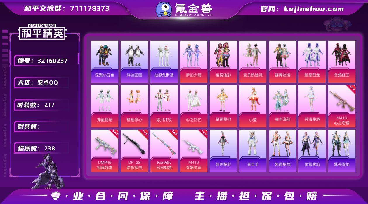 安卓【素材号 梦幻火箭/缤纷油彩/暗影哥特/M416-心之恋语(七级)/M416-女娲灵识(三级)】 手Q-14粉装-6特效枪-0载具-3粉色飞行器-76281热力值-14王牌印记-217套装-238枪皮 【热门品类】:粉装-梦幻火箭,粉装-缤纷油彩,套装-浪漫天命,套装-深海小丑鱼,套装-小丑鱼,套装-胖达圆圆,套装-动感兔斯基人偶服,套装-龟仙人,套装-潮萌小黄鸭,套装-暗影哥特,套装-浪漫波比,套装-红熊茄茄 【粉色套装】:粉装-宝贝奶油派,粉装-蝶舞迷情,粉装-梦幻火箭,粉装-缤纷油彩,粉装-新星烈龙,粉装-炙焰红王,粉装-海盐物语,粉装-橘柚倾心,粉装-冰川红玫,粉装-心之回忆,角色-呆萌星弥,角色-小蓝,粉装-金丰海韵,角色-荧海星豚 【粉色枪皮等级】:M416-心之恋语(七级),M416-女娲灵识(三级),UMP45-相思残雪(七级),Kar98K-巳巳如意(五级),DP-28-豹影疾电(五级) 【粉色枪皮】:M416-心之恋语,M416-女娲灵识,UMP45-相思残雪,Kar98K-巳巳如意,Mk14-福马献瑞,DP-28-豹影疾电 【粉色飞行器】:炫彩糖果飞行器,童趣迷兔飞行器,脆鲨七海飞行器 【粉色降落伞】:梦幻火箭降落伞,心之恋语降落伞,童趣迷兔降落伞,梦之光华降落伞,洛神天依降落伞,暗星紫秘降落伞,天之羽翼降落伞,恐龙拽拽降落伞,垂柳戏鸭降落伞,暗夜鎏金降落伞,蜜语绒猫降落伞,金丰海韵降落伞,月影灵韵降落伞,星穹咏叹调降落伞,喜羊羊与灰太狼降落伞,异瞳寒姬降落伞,炫彩糖果降落伞 【稀有套装】:套装-龟仙人,套装-熊抱抱,套装-航行童话,套装-巳巳如意,套装-小鸟芋圆,套装-雪国风尚,套装-炫彩糖果,套装-糖糖葫芦,套装-青团波波,角色-临安公主,套装-燕燕于飞,套装-鱼渊荷华,套装-粉恋花,套装-紫幽梦,套装-蓝冰羽,套装-星影赞美诗,套装-极速光影,套装-彩虹兔,套装-云朵鹅,套装-雪绒豹,角色-夜瞳黯灵,套装-朱霞炽焰...