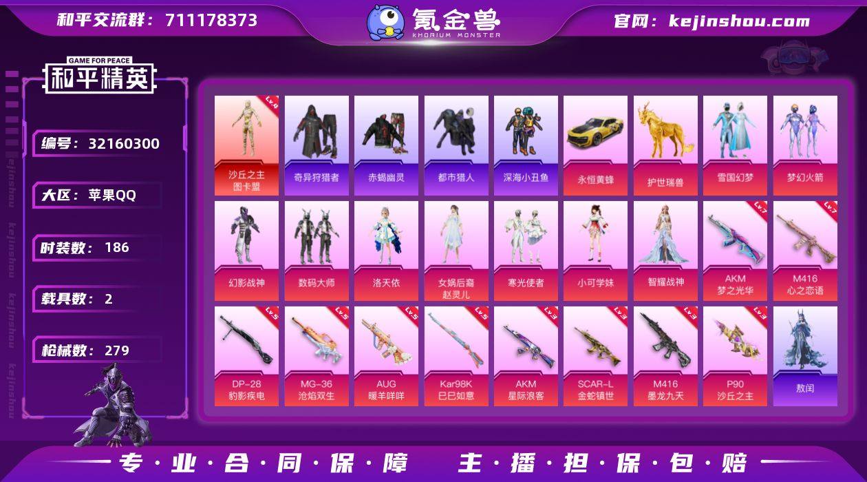 苹果 【极品神装号 沙丘之主-图卡盟(四级)/雪国幻梦/梦幻火箭/浪漫天命/赤蝎幽灵/都市猎人/深海小丑鱼/奇异狩猎者/2P战斗服款/Mark.06/洛天依/女娲后裔-赵灵儿/AKM-梦之光华(七级)/M416-心之恋语(七级)/永恒黄蜂,护世瑞兽】手Q-1神装-9粉装-11特效枪-2载具-10粉色飞行器-96071热力值-17王牌印记-186套装-279枪皮 【红色神装等级】:沙丘之主-图卡盟(四级) 【红色角色神装】:沙丘之主-图卡盟 【热门品类】:粉装-雪国幻梦,粉装-梦幻火箭,套装-浪漫天命,套装-赤蝎幽灵,套装-都市猎人,套装-深海小丑鱼,套装-小丑鱼,套装-奇异狩猎者,套装-忍者信条,角色-2B战斗服款,角色-2P战斗服款,套装-龟仙人,套装-红红火火,角色-Mark.06 【粉色套装】:粉装-幻影战神,粉装-数码大师,粉装-雪国幻梦,粉装-梦幻火箭,角色-洛天依,女娲后裔-赵灵儿,粉装-寒光使者,角色-小可学妹,角色-智耀战神 【粉色枪皮等级】:AKM-梦之光华(七级),AKM-星际浪客(三级),SCAR-L-金蛇镇世(三级),M416-心之恋语(七级),M416-墨龙九天(三级),AUG-暖羊咩咩(五级),P90-沙丘之主(三级),Kar98K-巳巳如意(五级),DP-28-豹影疾电(五级),MG-36-沧焰双生(五级) 【粉色载具】:永恒黄蜂,护世瑞兽 【粉色枪皮】:AKM-梦之光华,AKM-星际浪客,SCAR-L-金蛇镇世,M416-心之恋语,M416-墨龙九天,AUG-暖羊咩咩,P90-沙丘之主,Kar98K-巳巳如意,Mk14-福马献瑞,DP-28-豹影疾电,MG-36-沧焰双生 【粉色飞行器】:炫彩糖果飞行器,梦幻火箭飞行器,拂晓神骑飞行器,沙丘之主天马,镜域双华-灵镜之阶,龙翔九天飞行器,英伦信使飞行器,万象金身飞行器,彩虹独角兽飞行器,飞天猪飞行器 【粉色降落伞】:幻影战神降落伞,梦幻火箭降落伞,洛神天依降落伞,第五大道降落伞,飒粉甜心降落伞,拂晓神骑降落伞,精灵梦叶罗丽降落伞,墨龙九天降...