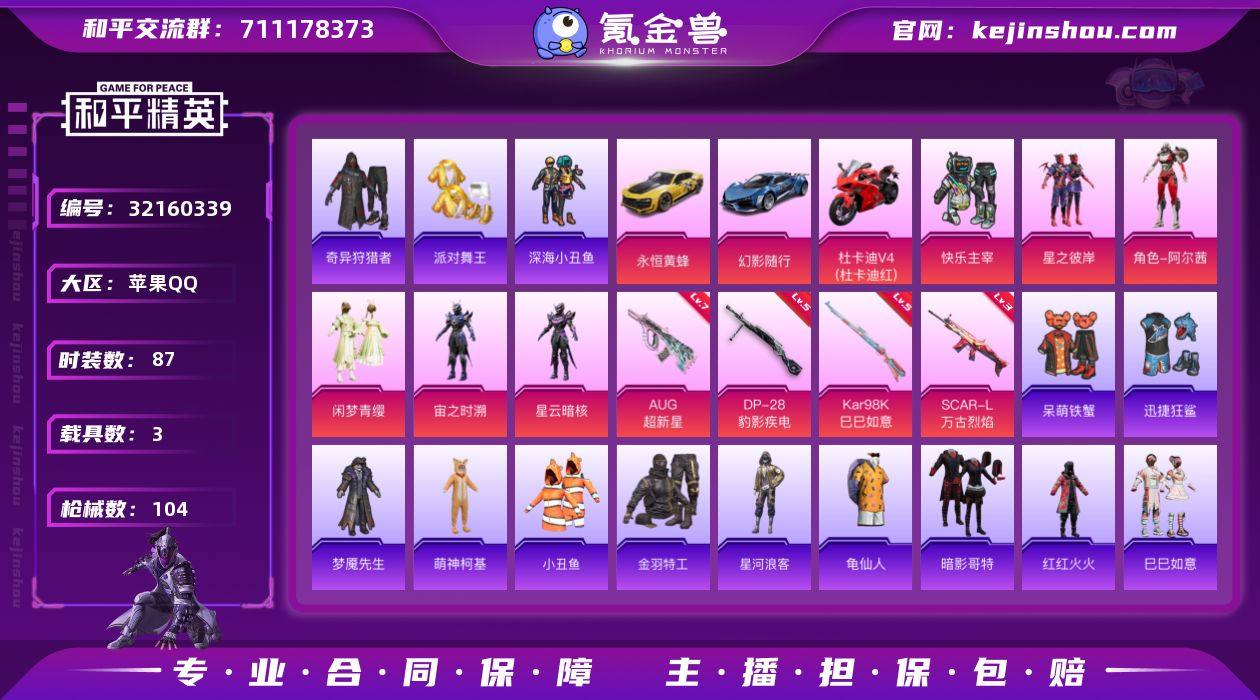苹果 【男神号 派对舞王/深海小丑鱼/奇异狩猎者/星河浪客/暗影哥特/AUG-超新星(七级)/永恒黄蜂,幻影随行,杜卡迪 Panigale V4(杜卡迪红),僚机-永恒黄蜂】手Q-6粉装-4特效枪-3载具-2粉色飞行器-36586热力值-3王牌印记-87套装-104枪皮 【热门品类】:套装-派对舞王,套装-深海小丑鱼,套装-小丑鱼,套装-奇异狩猎者,套装-金羽特工,套装-星河浪客,套装-龟仙人,套装-暗影哥特,套装-红红火火 【粉色套装】:粉装-快乐主宰,粉装-星之彼岸,角色-阿尔茜,粉装-闲梦青缨,角色-宙之时溯,角色-星云暗核 【粉色枪皮等级】:SCAR-L-万古烈焰(三级),AUG-超新星(七级),Kar98K-巳巳如意(五级),DP-28-豹影疾电(五级) 【粉色载具】:永恒黄蜂,幻影随行,杜卡迪 Panigale V4(杜卡迪红),僚机-永恒黄蜂 【粉色枪皮】:SCAR-L-万古烈焰,AUG-超新星,Kar98K-巳巳如意,DP-28-豹影疾电 【粉色飞行器】:星之彼岸飞行器,万古烈焰飞行器 【粉色降落伞】:快乐主宰降落伞,星之彼岸降落伞,环太平洋降落伞,闲梦青缨降落伞,万古烈焰降落伞,炫彩糖果降落伞 【稀有套装】:套装-龟仙人,套装-巳巳如意,角色-临安公主,套装-燕燕于飞,套装-鱼渊荷华 【稀有枪皮】:AKM-冰凉西瓜,AKM-奇异狩猎者,AKM-星之彼岸,AKM-破晓战魂,M16A4-幻世战舞者,M16A4-快乐主宰,SCAR-L-是爱神辣,SCAR-L-玉兔迎春,SCAR-L-黄金龙骨,M416-快乐主宰,M416-摩登王国,M416-红色方程式,GROZA-治愈之星,AUG-甜蜜菠萝,AUG-耀粉歌者,AUG-青春冒险家,M762-奇异狩猎者,M762-快乐主宰,M762-瑞龙福将,Mk47-摩登王国,AC-VAL-闲梦青缨,蜜獾-天降萌叽,UZI-天降萌叽,UMP45-快乐主宰,Vector-治愈之星,汤姆逊-奇异狩猎者,P90-倾城蜜语,P90-飞驰魅影,P90-巳巳如意,M24-奇异狩猎者,AWM-不夜海上花,VSS-星之彼岸,Mini14-炫彩节奏,...