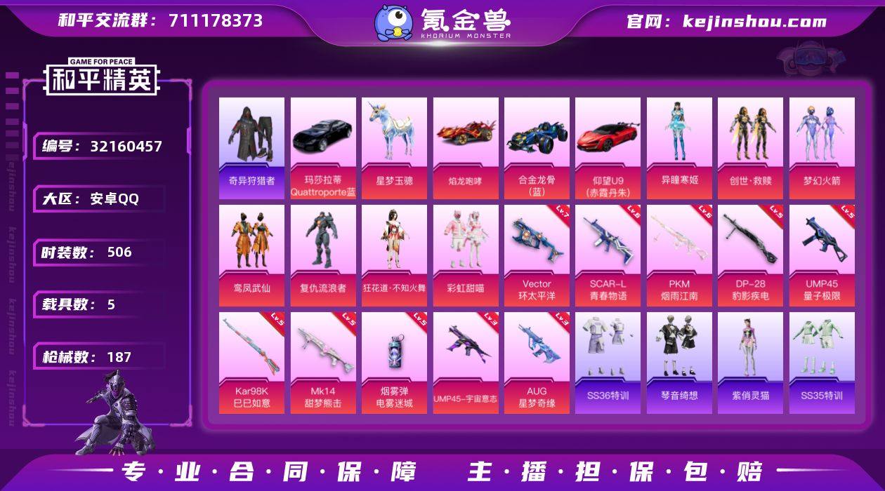 实名:可二次实名 是否支持人脸包赔:支持 粉装数量:7 特效枪数量:10 载具数:5 时装数:506 枪械数:187 奇异狩猎者 异瞳寒姬,彩虹甜喵,创世·救赎,复仇流浪者,狂花道·不知火舞,鸾凤武仙,梦幻火箭 七级Vector-环太平洋,六级PKM-江南烟雨,六级SCAR-L-青春物语,五级DP-28-豹影疾电,五级Kar98K-巳巳如意,五级MK14-甜梦熊击,五级UMP45-量子极限,五级烟雾弹-电雾迷城,三级AUG-星梦奇缘,三级UMP45-宇宙意志 玛莎拉蒂Quattroporte(夜幕蓝),合金龙骨(蓝),星梦玉骢,焰龙咆哮,仰望U9(赤霞丹朱) 琴音绮想,SS36特训,奇异狩猎者,炫彩糖果,紫俏灵猫,SS35特训,漫游都市,SS34特训套装,8号机,暗黑骑手,冰川特警,缤纷果语,白光莹,冰公主,冰河战士,白色伏地魔,春光漫游,雏菊兔兔,长空猛禽,创世·幻影,创世·追猎,纯真浪花,达芬奇,蝶变,大橘大利,多纳泰罗,电音精灵,飞驰魅影,绯格组合,龟仙人,光之冒险,海岛探路者,湖蓝色名流,黑色伏地魔,黄色伏地魔,黄色名流,黄色运动,红色运动,幻世战舞者,军刀雅典娜,惊鸿侠骨,橘黑制服,娇憨猪猪,竞技达人朋克,竞技角斗士,竞技名士,街头风暴,锦衣飞扬,金耀舞者,狂花道·娜可露露,狂花道·雅典娜,快闪甜心,龙的传人,拉斐尔,龙魂突击队,猎鹰,萝兰蝴蝶,猎梦纪元,蓝色运动,恋语绒绒,冷焰舞者,Mark.06,摩登魅猫,猛禽,萌黄之夏,米开朗基罗,魅力单车,麻辣教官,曼妙人鱼,萌趣咩咩,卖崽青蛙,霓虹热舞,柠萌假日,牛气冲天,牛气满满,破蛋小黄鸡,破晓战魂,青春校园,青年教官,青玉碎影,荣耀,热情海星,燃烧卡路里,深蓝色名流,SS20特训,SS21特训,SS22特训,SS23特训,SS24特训,SS25特训,SS26特训,SS27特训,SS28特训,SS29特训,SS30特训套装,SS31特训套装,SS32特训套装,SS33特训套装,巳巳如意,探宝勇士,天籁歌者,甜蜜告白,特训学院,甜心亚梦,完美偶像,王牌教练,炫蓝之夏,夏日音浪,香桃花海,星途旅人,小熊娃娃,虚音幻奏,夏雨游龙,雨林探路者,音速流光,玉兔迎春,云霞荷露,英勇保护者,异域银装,智慧隐士,智谋强哥 炫彩糖果飞行器,梦幻火箭飞行器,深渊漩涡飞行器,炫彩糖果降落伞,异瞳寒姬降落伞,创世·救赎降落伞,环太平洋降落伞,精灵梦叶罗丽降落伞,橘柚倾心降落伞,恐龙拽拽降落伞,冷魅冰骑降落伞,洛神天依降落伞,莲影清波降落伞,梦幻火箭降落伞,墨龙九天降落伞,拳皇·狂花道降落伞,忍者神龟降落伞,圣堂之誓降落伞,太空嘟嘟降落伞,星梦奇缘降落伞,宇宙意志降落伞