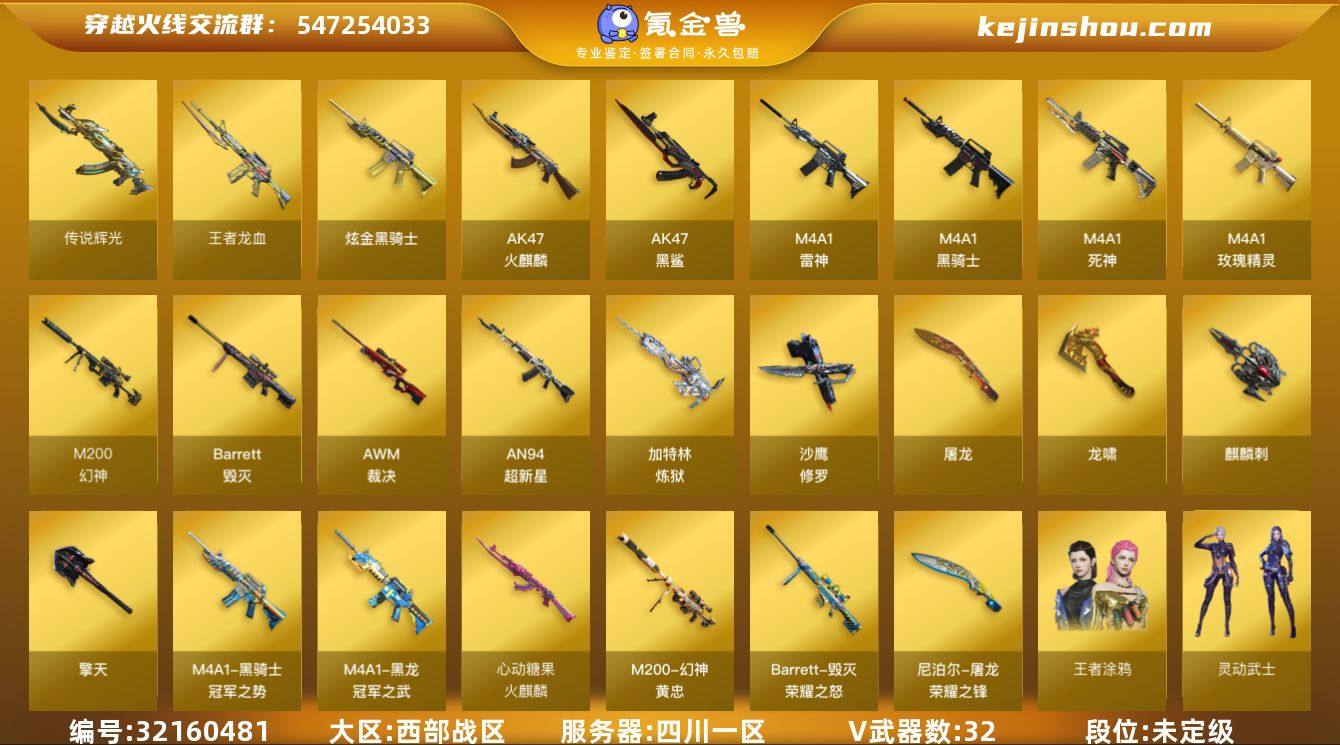 【幻神1皮】【异变清道夫】【6炼狱+炼狱-迷你小钢】【传说辉光】【M200-幻神】【M200-幻神-黄忠皮肤】【AWM-裁决】【炼狱-迷你小钢】【加特林-炼狱】【异变清道夫】【王者涂鸦】【M4A1-雷神】【AK47-火麒麟】【火麒麟-心动糖果】【M4A1-黑骑士】【黑骑士-冠军之势】【黑龙-冠军之武】【Barrett-毁灭】【毁灭-荣耀之怒】四川一区-32V-8王者-1炫金 【传说武器】:传说辉光 【热门武器】:传说辉光,M200-幻神,炼狱-迷你小钢,M4A1-黑骑士*2,加特林-炼狱*6,沙鹰-修罗*6,金刚伞 【王者炫金武器】:炫金骑士,王者龙血 【稀有皮肤】:M200-幻神-黄忠皮肤,火麒麟-心动糖果,黑骑士-冠军之势,黑龙-冠军之武,毁灭-荣耀之怒,屠龙-荣耀之锋 【角色】:王者涂鸦,灵动武士,暗黑审判 【人偶武器】:炼狱-迷你小钢,迷你波特博士,夺魂,迷你火种 【暴走生化】:炼狱-迷你小钢,异变清道夫*2,双面神*2 【挑战大师】:激光毁灭者III-白马银枪 【英雄级武器】:M4A1-雷神,M4A1-玫瑰精灵,M4A1-黑骑士*2,M4A1-死神,加特林-炼狱*6,AK47-火麒麟*2,AN94-超新星,Barrett-毁灭,AWM-裁决*2,M200-幻神,AK47-黑鲨,沙鹰-修罗*6,麒麟刺,擎天,龙啸,屠龙*3 【特殊枪械】:0白虎,2黑骑士,0烈龙,0盘龙,6炼狱,0蝴蝶斯泰尔