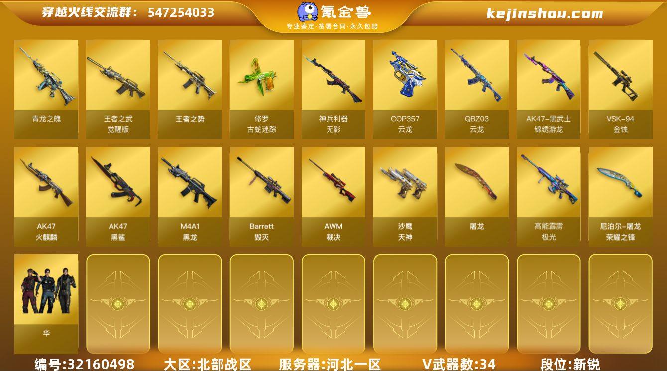 河北一区-35V-3王者-0炫金 【热门武器】:修罗-古蛇迷踪,青龙之魄,MK5-炽火炎龙 【王者炫金武器】:王者之势,青龙之魄 【皮肤】:毁灭-秦师 皮肤,极光-高能霹雳 皮肤,屠龙-荣耀之锋,龙啸-蛇姬 皮肤 【角色】:华,蛇隐宗,奇洋探员,电竞少女,飞虎队-X,猎狐者-追月,灵狐者-X,龙儿,曼陀罗-X,潘多拉-X,潜龙队-X,蛇姬,斯沃特-X,维纳斯,雪莉杨-摸金校尉,夜玫瑰-宠粉,樱-战斗天使,影武者-X,游珑儿 【人偶武器】:MK5-炽火炎龙,迷你牛牛*2,生化手雷-机甲核心 【暴走生化】:超级对讲机 【挑战大师】:神圣爆裂者-末日III 【英雄级武器】:AK47-火麒麟,M4A1-黑龙,AK47-黑鲨,无影-神兵利器,QBZ03-云龙,黑武士-锦绣游龙,王者之武-觉醒版,Barrett-毁灭,AWM-裁决,VSK-94-金蚀,沙鹰-天神,COP 357-云龙*3,修罗-古蛇迷踪,屠龙,高爆手雷-云龙*7,手雷-热带奇洋,高爆手雷-古蛇迷踪,闪光弹-雷暴,闪光弹-竞技荣光,闪光弹-云龙*4,烟雾弹-云龙*6,烟雾弹-古蛇迷踪 【道具】:冰冰企鹅背包,古蛇迷踪炫彩背包,奇洋探员-海龟背包,超级背包,绿色巨人,灵魂忍者,变异宝贝,迷雾幽灵,夺命之镰,防化服,金色流光-枪王排位,星辰流光-枪王排位,枪王排位...