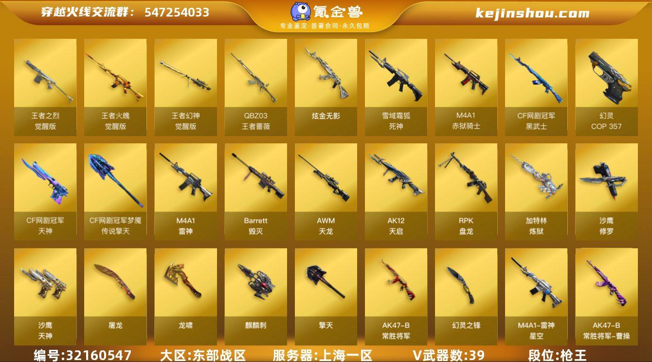 上海一区-41V-6王者-1炫金【双全号 QBZ-03-王者蔷薇,炼狱-迷你小钢,RPK-盘龙*5,加特林-炼狱,斯泰尔-蝴蝶,COP 357-幻灵,沙鹰-修罗,金刚伞】 【热门武器】:QBZ-03-王者蔷薇,炼狱-迷你小钢,RPK-盘龙*5,加特林-炼狱,斯泰尔-蝴蝶,COP 357-幻灵,沙鹰-修罗,金刚伞 【王者炫金武器】:QBZ-03-王者蔷薇,炫金无影 【音效卡】:M4A1-雷神音效卡,死神-雪域霜狐-怀旧音效卡 【皮肤】:雷神-星空,毁灭-黑大圣皮肤,毁灭-魔灵皮肤,战神-粉色甜心皮肤,战神-紫绶金章皮肤,AK47-B-常胜将军-曹操,AK47-B-常胜将军-刘备*2,炼狱-星空 【角色】:葵,战地猎狐,王者玲珑,雪域霜狐,乔伊教练,修道士,云海玲珑,暗夜-X,初恋灵狐,虎妞,娟娟,灵狐者-黄金海岸,龙儿,龙儿-小淘气,潘多拉-X 【人偶武器】:炼狱-迷你小钢,斯泰尔-蝴蝶,COP-旗袍,迷你裂空之翼*2,迷你生化手雷,闪光弹-小乔,闪光弹-貂蝉,高爆手雷-大乔 【暴走生化】:黑龙吞噬者,超级对讲机 【挑战大师】:神圣爆裂者III*2,激光毁灭者III-白马银枪,VEPR-12-金魔*2,激光毁灭者III,阐释者III*2 【英雄级武器】:M4A1-雷神,AK12-天启,死神-雪域霜狐,王者火魄-觉醒版,AK47-B-常胜将军,王者之烈-觉...