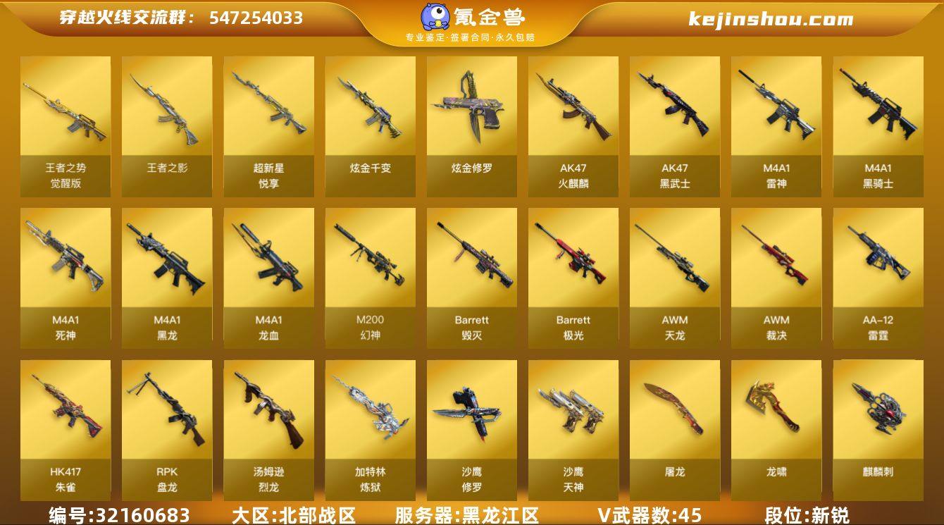 黑龙江区-47V-3王者-2炫金 【热门武器】:HK417-朱雀,M200-幻神,死亡之眼,M4A1-黑骑士*2,汤姆逊-烈龙*6,RPK-盘龙*6,加特林-炼狱,斯泰尔-蝴蝶,沙鹰-修罗*5 【王者炫金武器】:超新星-悦享,王者之影,炫金千变,炫金修罗 【皮肤】:M200-幻神-黄忠皮肤,雷神-暗月*2,雷神-星空,M4A1-战神赵云,火麒麟-雷神,毁灭耀金皮肤,战神-粉色甜心皮肤,战神-紫绶金章皮肤,炼狱-星空 【角色】:葵,樱,王者-瞳-闭月羞花,空,暗夜-X,风暴女,潘多拉-X,潜龙队-X,新娜塔莎,影武者-X 【人偶武器】:斯泰尔-蝴蝶,COP-旗袍,迷你生化手雷*2 【暴走生化】:死亡之眼 【英雄级武器】:AK47-火麒麟,M4A1-黑龙,M4A1-雷神,M4A1-黑骑士*2,M4A1-死神,AK47-黑武士,M4A1-龙血*2,HK417-朱雀,王者之势-觉醒版,AWM-天龙,Barrett-毁灭*2,Barrett-极光,AWM-裁决,M200-幻神,RPK-盘龙*6,加特林-炼狱,汤姆逊-烈龙*6,AA-12-雷霆,沙鹰-修罗*5,沙鹰-天神,屠龙,龙啸*2,擎天,麒麟刺*3 【道具】:炫彩背包,老虎背包,虎牙炫彩背包,超级背包,妩媚妖姬,黄金生化钩,变异宝贝,夺命之镰,防化服,EP战队名片,C4-红龙,防弹头盔,防弹衣*2,C4工具钳,手雷包 【特殊枪械】:蝴蝶斯泰尔+6烈龙,2黑骑士,6烈龙,6盘龙,1炼狱,1蝴蝶斯泰尔