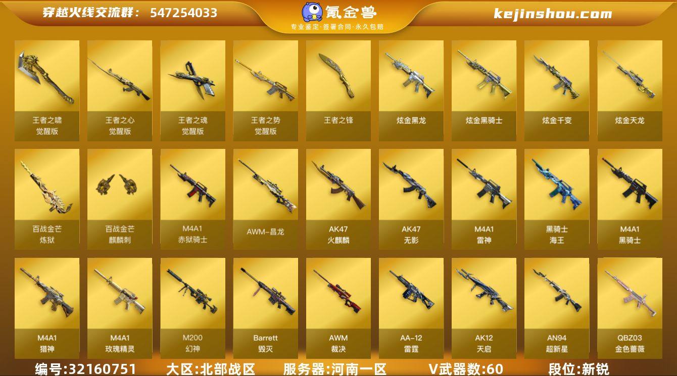 河南一区-65V-17王者-4炫金 【热门武器】:QBZ03-金色蔷薇,Scar Light-白虎,M4A1-青龙,M200-幻神,死亡之眼,荣耀世冠-火麒麟,荣耀世冠-雷神,荣耀世冠-柯尔特,M4A1-黑骑士,汤姆逊-烈龙*6,RPK-盘龙*4,加特林-炼狱*3,羊驼玩偶,沙鹰-修罗*2,荣耀世冠-龙啸 【王者炫金武器】:王者之锋,炫金骑士,炫金黑龙,炫金千变,炫金天龙,王者之魄高爆手雷*4,王者之魄闪光弹*6 【音效卡】:AK47-火麒麟音效卡,M4A1-黑骑士音效卡,Barrett-毁灭音效卡,Barrett-碧霄极光音效卡,麒麟刺-百战金芒-盛典舞曲音效卡,白虎-盛典舞曲音效卡,炼狱-百战金芒-庆典舞曲音效卡 【皮肤】:幻神-冠军之幻,裁决-胜者为王 皮肤,雷神-虎将,雷神-耀金皮肤,雷神-R.LGD-CFPLS18冠军,雷神-烈虎皮肤,M4A1-再燃火线,雷神-神秘按键 皮肤,火麒麟-华夏之心,火麒麟-平天大圣,毁灭-暗月*2,毁灭-冠军之怒,毁灭-黑大圣皮肤,黑骑士-AG-S4冠军典藏,无影耀金皮肤,战神-粉色甜心皮肤,战神-紫绶金章皮肤,战神-流金岁月皮肤,AK47-B-常胜将军-曹操*2,AK47-B-常胜将军-刘备,AK47-B-常胜将军-孙权,轻型军用手斧-再燃火线,擎天-冠军之击 【角色】:葵,魅影,战地猎狐,王者涂鸦,王者-魅影,云海玲珑,暗夜-X,初恋灵狐,虎妞,嘉年华灵狐,娟娟,龙儿,曼陀罗-X,潘多拉-X,潘多拉-甜心教官,邱刚敖,蜀雪,铁骑-乘风破浪,铁骑荣耀,雪莉杨-摸金校尉,职业选手 【人偶武器】:AWM-灵狐-15周年嘉年华,海滩汪汪-巴雷特,COP-旗袍,夺魂,迷你牛牛,迷你生化手雷,闪光弹-小乔,闪光弹-貂蝉,高爆手雷-大乔,灵狐娃娃手雷 【暴走生化】:死亡之眼 【挑战大师】:致命乱世-超越Max,AK47-冰龙粉碎者,激光毁灭者III*2,试炼破坏者III 【英雄级武器】:AK47-火麒麟,M4A1-雷神,M4A1-黑骑士,AK47-无影,AK12-天启,AN94-超新星,M...