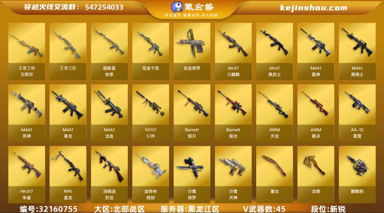 黑龙江区-47V-3王者-2炫金 【热门武器】:HK417-朱雀,M200-幻神,死亡之眼,M4A1-黑骑士*2,汤姆逊-烈龙*6,RPK-盘龙*6,加特林-炼狱,斯泰尔-蝴蝶,沙鹰-修罗*5 【王者炫金武器】:超新星-悦享,王者之影,炫金千变,炫金修罗 【皮肤】:M200-幻神-黄忠皮肤,雷神-暗月*2,雷神-星空,M4A1-战神赵云,火麒麟-雷神,毁灭耀金皮肤,战神-粉色甜心皮肤,战神-紫绶金章皮肤,炼狱-星空 【角色】:葵,樱,王者-瞳-闭月羞花,空,暗夜-X,风暴女,潘多拉-X,潜龙队-X,新娜塔莎,影武者-X 【人偶武器】:斯泰尔-蝴蝶,COP-旗袍,迷你生化手雷*2 【暴走生化】:死亡之眼 【英雄级武器】:AK47-火麒麟,M4A1-黑龙,M4A1-雷神,M4A1-黑骑士*2,M4A1-死神,AK47-黑武士,M4A1-龙血*2,HK417-朱雀,王者之势-觉醒版,AWM-天龙,Barrett-毁灭*2,Barrett-极光,AWM-裁决,M200-幻神,RPK-盘龙*6,加特林-炼狱,汤姆逊-烈龙*6,AA-12-雷霆,沙鹰-修罗*5,沙鹰-天神,屠龙,龙啸*2,擎天,麒麟刺*3 【道具】:炫彩背包,老虎背包,虎牙炫彩背包,超级背包,妩媚妖姬,黄金生化钩,变异宝贝,夺命之镰,防化服,EP战队名片,C4-红龙,防弹头盔,防弹衣*2,C4工具钳,手雷包 【特殊枪械】:蝴蝶斯泰尔+6烈龙,2黑骑士,6烈龙,6盘龙,1炼狱,1蝴蝶斯泰尔
