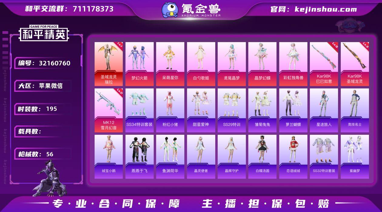 TY708-精品公主号-可二次-【二字ID】【一级神装瑞拉】【幻火箭,白勺歌姬,呆萌星弥,鸢尾晶梦,晶梦幻蝶,彩虹独角兽,粉红小猪】苹果 微信-1神装-6粉装-3特效枪-0载具-2粉色飞行器-19341热力值-3王牌印记-50套装-56枪皮 【红色神装等级】:圣域龙灵-瑞拉(一级) 【红色角色神装】:圣域龙灵-瑞拉 【热门品类】:粉装-梦幻火箭,套装-粉红小猪 【粉色套装】:粉装-梦幻火箭,角色-白勺歌姬,角色-呆萌星弥,角色-鸢尾晶梦,角色-晶梦幻蝶,角色-彩虹独角兽 【粉色枪皮等级】:汤姆逊-星月云朵(二级MK12-雪月幻音),Kar98K-巳巳如意(五级),Kar98K-圣域龙灵(三级) 【粉色枪皮】:Kar98K-巳巳如意,Kar98K-圣域龙灵,MK12-雪月幻音 【粉色飞行器】:彩虹独角兽飞行器,圣域金龙飞行器 【粉色降落伞】:梦幻火箭降落伞,白勺歌姬降落伞,蜜语绒猫降落伞,晶梦幻蝶降落伞,彩虹独角兽降落伞,圣域龙灵降落伞 【稀有套装】:套装-绒宝小鹅,套装-雏菊兔兔,套装-萝兰蝴蝶,套装-燕燕于飞,套装-鱼渊荷华,套装-晶灵使者,套装-晶辉守护,角色-幽秘之星,角色-冷霜之星,套装-紫幽梦,套装-蓝冰羽 【营地ID】:973173879