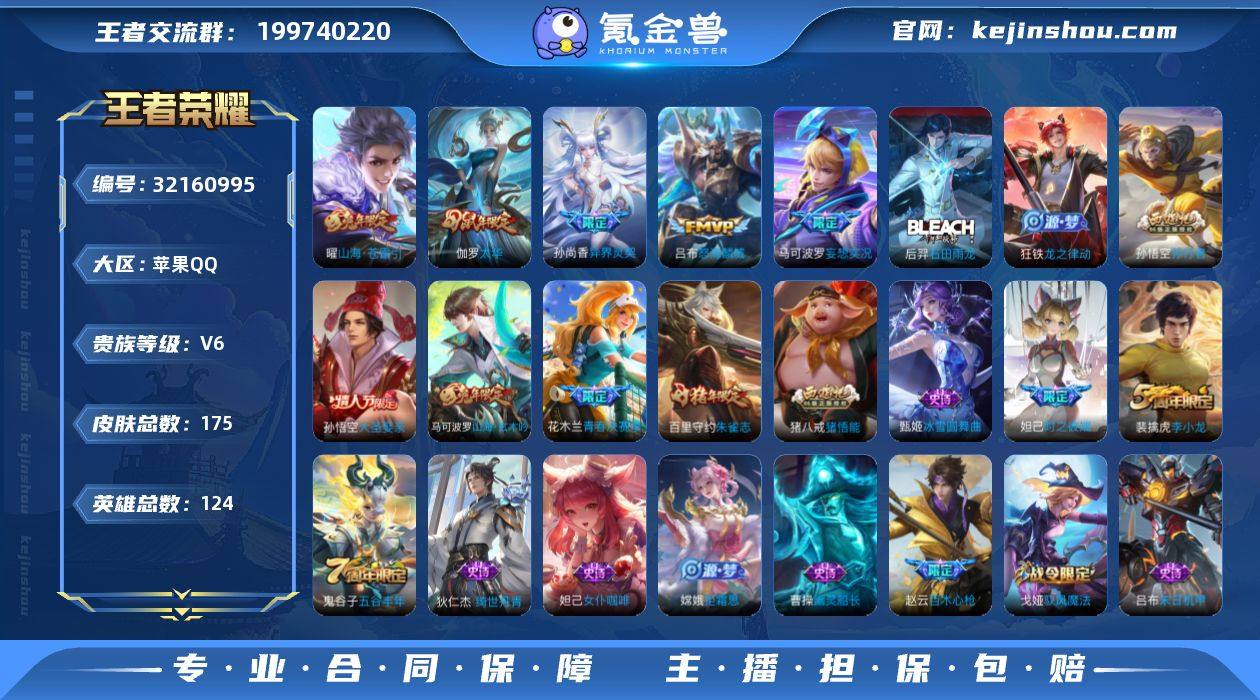 实名: 可修改 性别: 男号 贵族等级: V6 英雄数: 124 皮肤数: 175 传说皮: 山海·苍雷引,妄想实况 限定皮: 李小龙,异界灵契-孙尚香,时之彼端,乒乒小将,太华,青春决赛季,朱雀志,大圣娶亲,高山流水,孙行者,猪悟能,匿光追影者,百木心枪,匿光决锋者,五谷丰年,怒海麟威,山海·玄木吟 亮点: 【优质装备】:山海·苍雷引(电光曜子),妄想实况