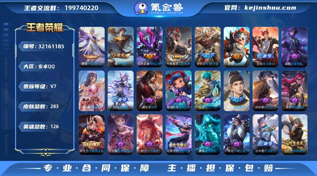 V7 1典藏 9传说 126英雄 283皮肤 可修改实名 男号 【英雄全皮】影全皮 【稀有英雄】大司命,嬴政(始皇帝),韩信(韩跳跳),夏洛特(夏师傅),艾琳,橘右京(橘子),娜可露露(鸟人),不知火舞,赵云,金蝉(唐僧),戈娅 【荣耀水晶】神鉴启示录 【传说皮】神树通天,李逍遥,零号·赤焰,地狱之眼,久胜战神,胖达荣荣 【珍宝阁皮】优雅恋人,蔷薇恋人,玩趣恶龙 【赛季/战令皮】噬灭天穹(s37),古海寻踪(s33),星界游侠,海盐诗旅(s30),擒涛扼浪(s31),探海日志(s32),顽趣-梦奇,剑破天穹(s35),天穹祈灯(s34),青焰无极,苍威无极,天穹之誓(s36),暖冬·兔眠,重明(s11),穷奇(s12),御狮(s13),御霄(s14),御旌(s15),御銮(s16),朔风刀(s17),混沌棋(s18),疑决卦(s19),醍醐杖(s20),原初探秘者(s21),万华元夜(s22),演武夺筹(s23),驱傩正仪(s24),千军破阵(s25),蓝屏警告,夺宝奇兵,迷踪丽影,西部大镖客-猪八戒,圣弓游侠,真爱魔法,火炮绅士,沙漠行僧(s26),幻夜卜梦,金庭之子(s27),大漠名商(s28),云中旅人(s29),超时空战士-钟无艳,落雪兰心 【史诗皮】谪仙醉月,破空之剑,星界特工,星界战将,百相守梦-百里守约,茶境仙,东方月初,蔬乡物语(鲁班七号),怒海争锋,化蝶舞,线条小狗-周瑜,万灵启世,灵蛊蚀心,龙之律动,紫霞仙子,电玩小子(小书包),黄金分割率,特工魅影,千年之狐,江河有灵,蒙恬荣光圣徽,无限星赏官,冰冠公主,偶像歌手,百相守梦(关羽),暗夜猫娘,末日机甲-吕布,猫狗日记-孙策,猫狗日记-大乔,时之恋人-孙尚香,乱世虎臣,节奏热浪,修罗,女仆咖啡,摇滚巨星,水果甜心,绅士熊喵,天才门将,星夜王子,功夫厨神,暗隐猎兽者,幽灵船长,鬼剑武藏,心灵战警,天秀·启明,地狱岩魂,诗语江南,纤云弄巧,缤纷独角兽,乘风破浪,逐浪之夏,水晶猎龙者,箭羽风息,金属风暴,原初追逐者,圣诞狂欢,圣诞恋歌,鹰眼统帅,魅力维加斯,黎明之约