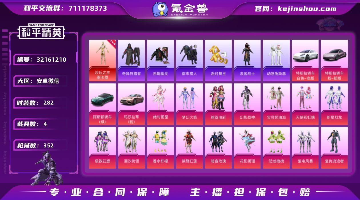 安卓 微信-1神装-20粉装-14特效枪-4载具-6粉色飞行器-132408热力值-24王牌印记-282套装-352枪皮 【红色神装等级】:沙丘之主-图卡盟(四级) 【红色角色神装】:沙丘之主-图卡盟 【热门品类】:粉装-梦幻火箭,粉装-缤纷油彩,绝对防御上衣,套装-浪漫天命,套装-赤蝎幽灵,套装-都市猎人,套装-派对舞王,套装-奇异狩猎者,套装-金羽特工,套装-忍者信条,套装-星河浪客,套装-浪客战士,套装-动感兔斯基人偶服,套装-SS1特训,套装-龟仙人,套装-潮萌小黄鸭,套装-暗影哥特,套装-粉红小猪,角色-8号机,熔岩游骑兵连帽夹克 【粉色套装】:角色-绝对恒星,粉装-幻影战神,粉装-宝贝奶油派,粉装-天使彩虹糖,粉装-梦幻火箭,粉装-缤纷油彩,粉装-新星烈龙,粉装-极致幻想,粉装-潮汐统领,粉装-香水柠檬,粉装-桀骜红莲,粉装-暗夜玫瑰,粉装-花影阑珊,粉装-恐龙拽拽,粉装-紫电风暴,角色-复仇流浪者,粉装-冰川幽秘,粉装-青空秋雨,角色-圣堂之誓,粉装-未来领航者 【粉色枪皮等级】:AKM-甜心宝贝(五级),AKM-炫紫旋律(一级),SCAR-L-锦绣绵绵(五级),M416-心之恋语(七级),GROZA-镜光银凌(五级),AUG-星之彼岸(七级),M762-甜蜜誓约(七级),AKS-74U-森灵之息(五级),P90-沙丘之主(三级),Kar98K-伏魔团(四级),Kar98K-巳巳如意(二级),M24-暗星紫秘(四级),SLR-暗夜玫瑰(四级),DP-28-豹影疾电(四级) 【粉色载具】:特斯拉Model 3(珍珠白),特斯拉Roadster(沁心粉),阿斯顿马丁DBS(绿),玛莎拉蒂Ghibli(粉),空客H135-蔚蓝之翼 【粉色枪皮】:AKM-甜心宝贝,AKM-炫紫旋律,SCAR-L-锦绣绵绵,M416-心之恋语,GROZA-镜光银凌,AUG-星之彼岸,M762-甜蜜誓约,AKS-74U-森灵之息,P90-沙丘之主,Kar98K-伏魔团,Kar98K-巳巳如意,M24-暗星紫秘,SLR-暗夜玫瑰,DP-28-豹影疾电 【粉色飞行器】:绝对恒星飞...