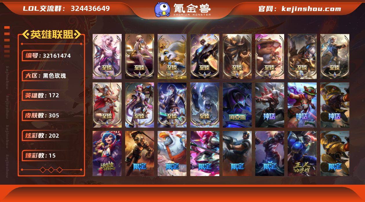 【LDC2760】172英雄/305皮肤/21神话/29限定/15臻彩/202炫彩/28传说/56史诗/未定级账号等级:627/10周年 安妮/十五周年纪念 希维尔/新卧虎藏龙 贾克斯/殿堂传奇 薇恩/海克斯 魔腾/至臻 青花瓷 千珏/至臻 黑夜使者 凯隐/至臻 幻灵战斗猫 金克丝/至臻 K/DA 伊芙琳/至臻 灵魂莲华 提莫/至臻 绒毛菲兹/至臻 神凰行者 烈羽焰凰 霞/至臻 神龙尊者 炎龙瑟提/至臻 王国机神玄武 盖伦/至臻 未来战士 锤石/至臻 心之钢 永恩/至臻蒙面女郎莫甘娜/至臻 暗裔英雄 嘉文四世/至臻 灵魂莲华 拉克丝/至臻永恒星灵佐伊/至臻 灵魂莲华 劫/冰霜之刃 艾瑞莉娅 炫金/神龙尊者 圣龙李青 登龙/玉剑传说 翼剑仙 珠光/山海绘卷 科加斯 朱红/星之吞噬者 莫甘娜 热情之末/可爱可爱粉红红 布里茨/星之守护者 阿卡丽 未来之光/春晖神女 艾希 玉露金风/星之守护者 阿卡丽 热情之光/魔女 阿卡丽 虚荣/净雪之月 莫甘娜 冬虹/龙马烈焰波比/水晶玫瑰 婕拉/北极星猎人 斯维因/北极星发明家 塞拉斯/卧虎藏龙 贾克斯/冠军之刃 锐雯 2016/S1FNC 卡尔萨斯/S2 暗杀星 发条/S2 暗杀星 努努/S3 SKT T1 贾克斯/S3 SKT T1 薇恩/S8 IG 卡莎/暗裔英雄 盖伦/胜利之树 茂凯/胜利枪神 卢锡安/胜利凤凰 艾尼维亚/胜利之王 泰达米尔/胜利巨口 克格莫/胜利女神 娑娜/胜利剑圣 易/胜利女神-菲奥娜/南瓜头 费德提克/泳池派对 塔莉垭/电玩战魂 赫卡里姆/玉剑传说 舞龙卫/防暴士兵 格雷福斯/防暴天使 凯尔/警用试作体K-9 内瑟斯/鸡里奥/日蚀骑士 希维尔/提莫:"约德尔人的一大步"/欧米伽小队 幽灵特工/合金巨兽 努努和威朗普/黯晶凤凰 艾尼维亚/冰霜之刃 艾瑞莉娅/神拳 李青/神龙尊者 圣龙李青/炼狱魔犬 内瑟斯/星之守护者 阿卡丽/钢铁军团 盖伦/月蚀骑士 蕾欧娜/黯黑魔龙 希瓦娜/冰霜亚龙 希瓦娜/偶像歌手 阿狸/星之守护者 阿狸/宇航员 诺提勒斯/金牌主播 德莱文/蔷薇绅士 杰斯...