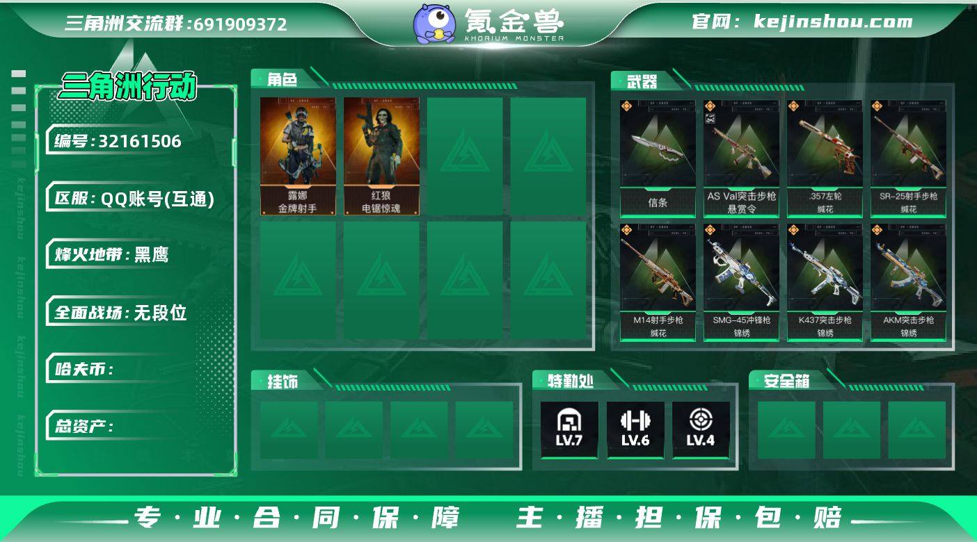 hf14605总资产96m+电锯惊魂红狼+信条全套+锦绣全套+缄花全套+悬赏令优品s+s7s8赛季通行证+烽火等级60+特勤部门等级可以+永久包赔
