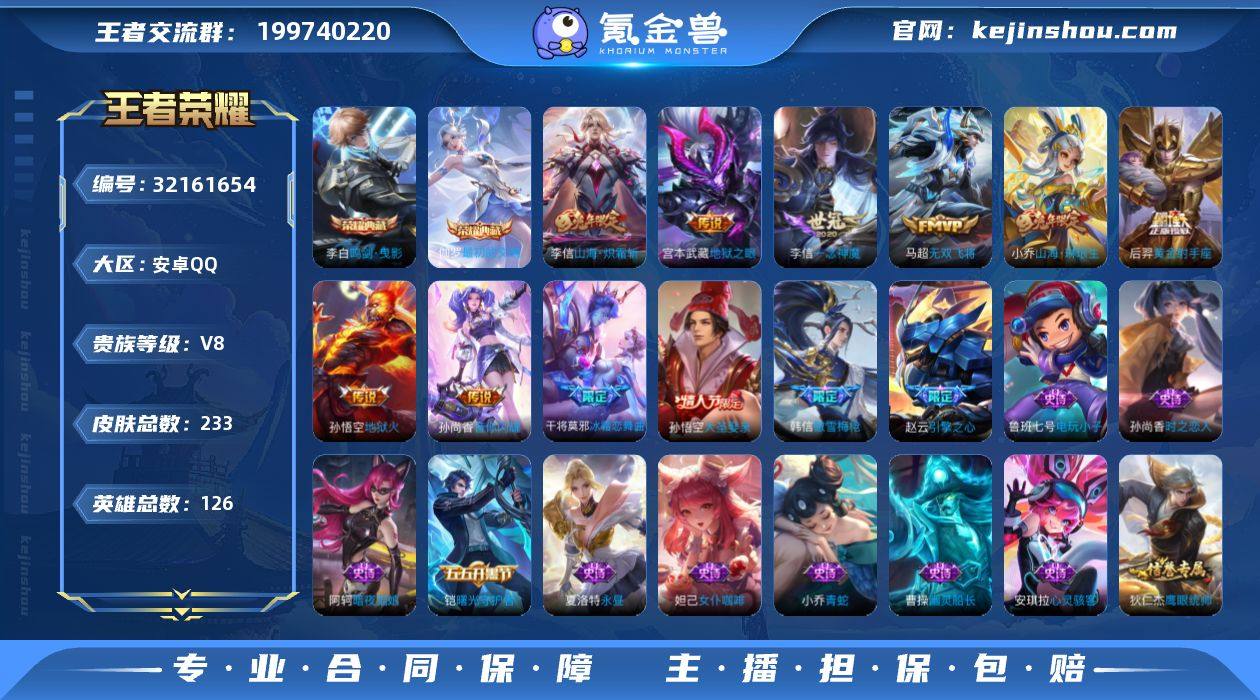 V8 2典藏 17传说 126英雄 233皮肤 可修改实名 男号 【稀有英雄】大司命,嬴政(始皇帝),韩信(韩跳跳),夏洛特(夏师傅),艾琳,橘右京(橘子),娜可露露(鸟人),不知火舞,赵云,金蝉(唐僧),戈娅 【荣耀水晶】最初的交响(伽罗典藏),鸣剑·曳影 【传说皮】山海·炽霜斩(李信年限),山海·琳琅生(小乔年限),黄金射手座,地狱火,地狱之眼,一念神魔,无双飞将,音你闪耀(rap皮) 【珍宝阁皮】万物之道,玩趣恶龙 【赛季/战令皮】噬灭天穹(s37),古海寻踪(s33),海盐诗旅(s30),擒涛扼浪(s31),探海日志(s32),剑破天穹(s35),天穹祈灯(s34),天穹之誓(s36),狰(s8),饕餮(s9),烛龙(s10),重明(s11),御狮(s13),御霄(s14),御銮(s16),朔风刀(s17),混沌棋(s18),疑决卦(s19),醍醐杖(s20),原初探秘者(s21),万华元夜(s22),演武夺筹(s23),驱傩正仪(s24),千军破阵(s25),猎兽之王,白昼王子,潮玩骑士王,云间偶戏,火炮绅士,沙漠行僧(s26),幻夜卜梦,金庭之子(s27),电玩高手(电玩铁子),午后时光,大漠名商(s28),云中旅人(s29),超时空战士-钟无艳,落雪兰心 【史诗皮】电玩小子(小书包),黄金分割率,永昼,冰冠公主,青蛇,偶像歌手,龙骑士(小龙虾),暗夜猫娘,末日机甲-吕布,猫狗日记-孙策,猫狗日记-大乔,时之恋人-孙尚香,乱世虎臣,节...