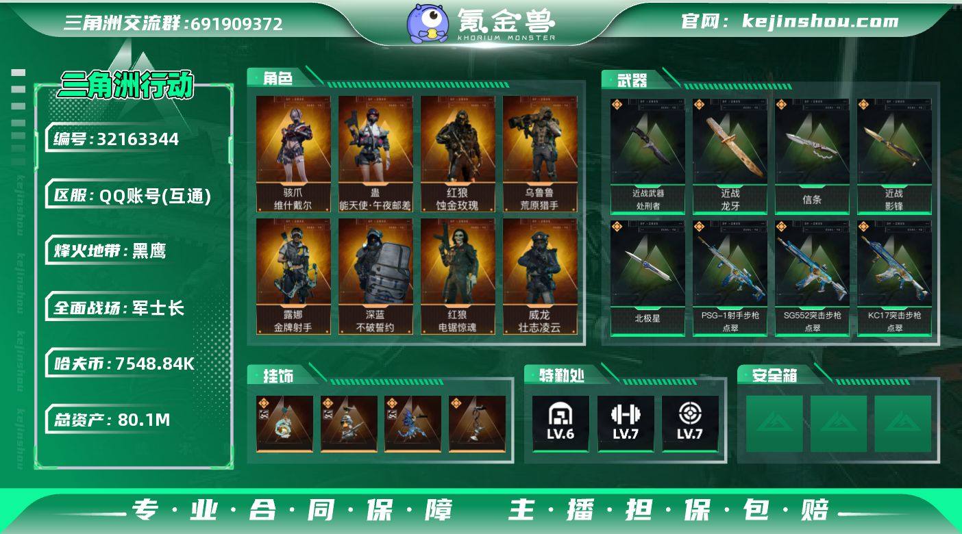 实名:可二次实名 总资产:80.1M 哈夫币:7548.84K 烽火地带段位:黑鹰 烽火地带等级:60 全面战场段位:军士长 全面战场等级:50 6级仓库,7级训练中心,7级靶场,6级指挥中心,1级潜水中心,3级防具台,3级工作台,3级制药台,3级技术中心,0级收藏室 战术部门等级:3 战斗部门等级:3 医疗部门等级:3 研发部门等级:3 后勤部门等级:3 曼德尔砖-气象感应:0 曼德尔砖-命运王牌:0 曼德尔砖-电玩高手:3 曼德尔砖-美杜莎:0