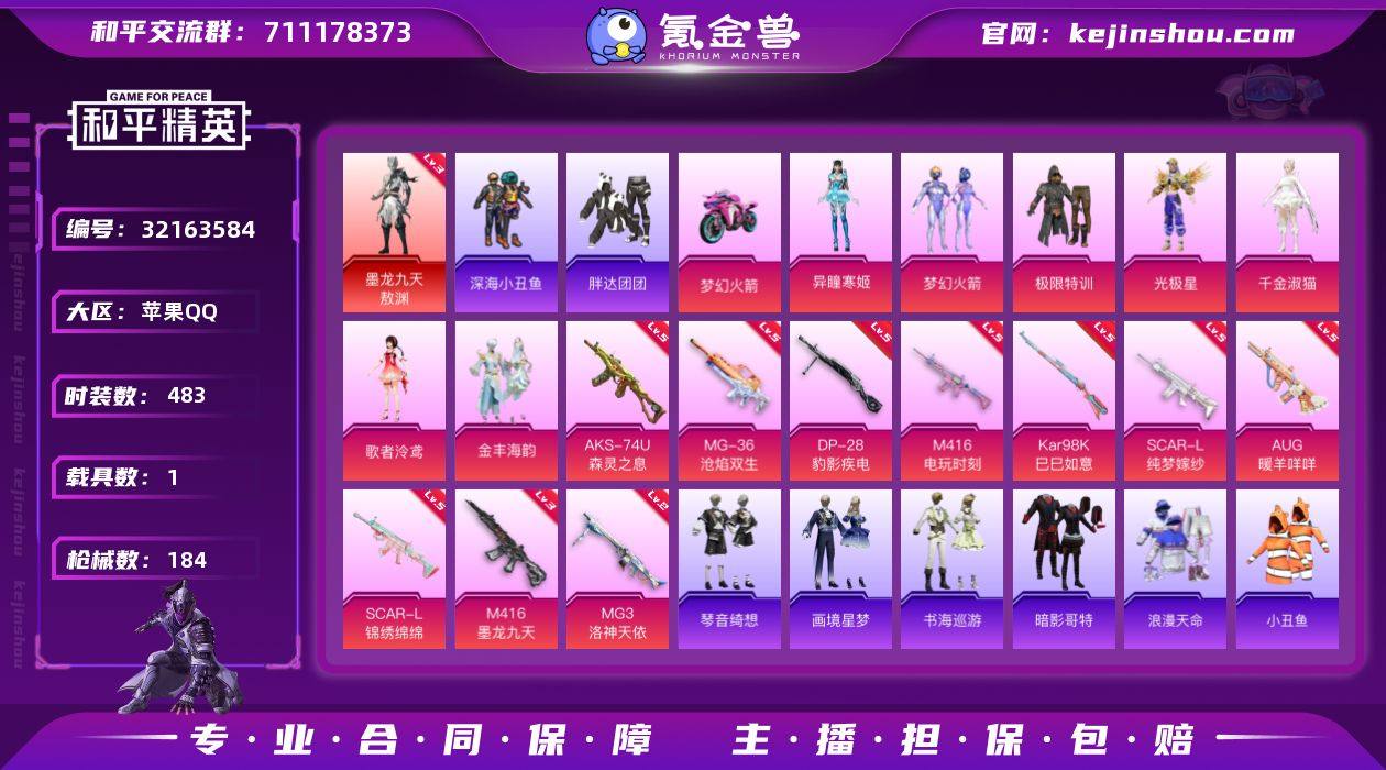 【特价出售】苹果Q-1红装2稀有1载具7粉装14特效枪12热门123套装184枪皮 58183热力值 7印记 历史无敌战神 【1红装】 墨龙九天-敖渊 (3级) 【2稀有】 AKM-缤纷海域 浪漫天命 【1载具】 双人摩托梦幻火箭 【7粉装】 梦幻火箭 光极星 千金淑猫 金丰海韵 异瞳寒姬 极限特训 歌者泠鸢 【14特效枪】 SCAR-L-纯梦嫁纱 (5级) SCAR-L-锦绣绵绵 (5级) M416-墨龙九天 (3级) M416-电玩时刻 (5级) AKS-74U-森灵之息 (5级) Kar98K-巳巳如意 (5级) MG-36-沧焰双生 (5级) DP-28-豹影疾电 (5级) AUG-暖羊咩咩 (5级) MG3-洛神天依 (2级) AKS-74U-森灵之息 (5级) Mk14-福马献瑞 (5级) AA12-G-萌骑幻想 (2级) 烟雾弹-电雾迷城 (5级) 【12热门】 Mark.06 小丑鱼 龟仙人 呆萌铁蟹 迅捷狂鲨 深海小丑鱼 胖达团团 暗影哥特 粉红小猪 水银刺客 影双刃 弄潮海豚 【3飞行器】 龙翔九天飞行器 齐天大圣飞行器 绝色倾城飞行器 【2头盔】 梦幻火箭头盔 深海小丑鱼头盔 【2背包】 深海小丑鱼背包 心之恋语背包